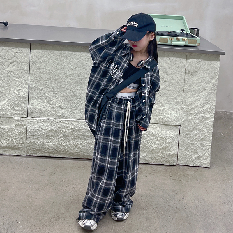 女童春装套装潮酷街舞表演服春秋儿童外套嘻哈爵士舞蹈服格子衬衫