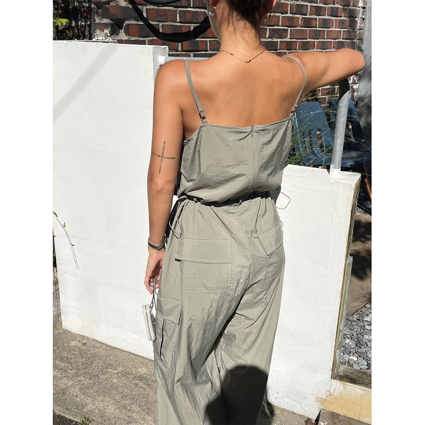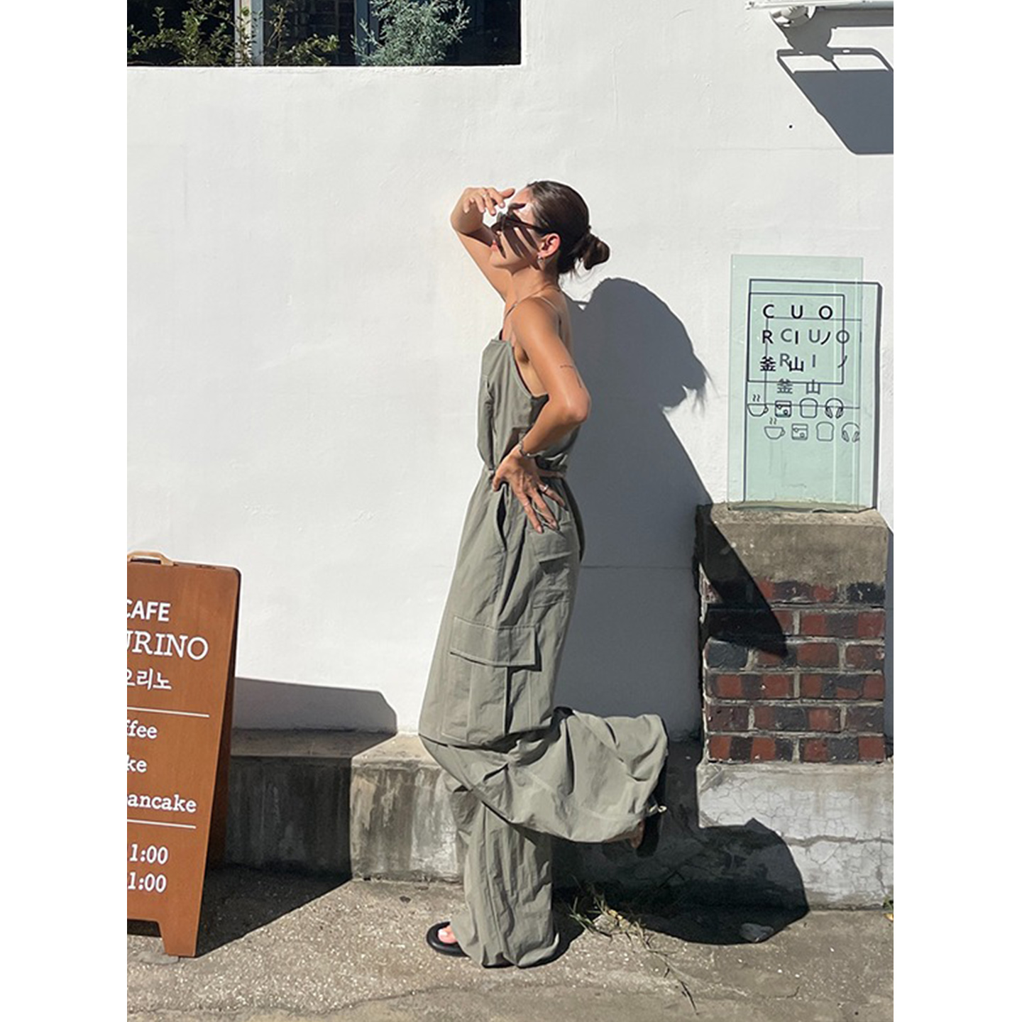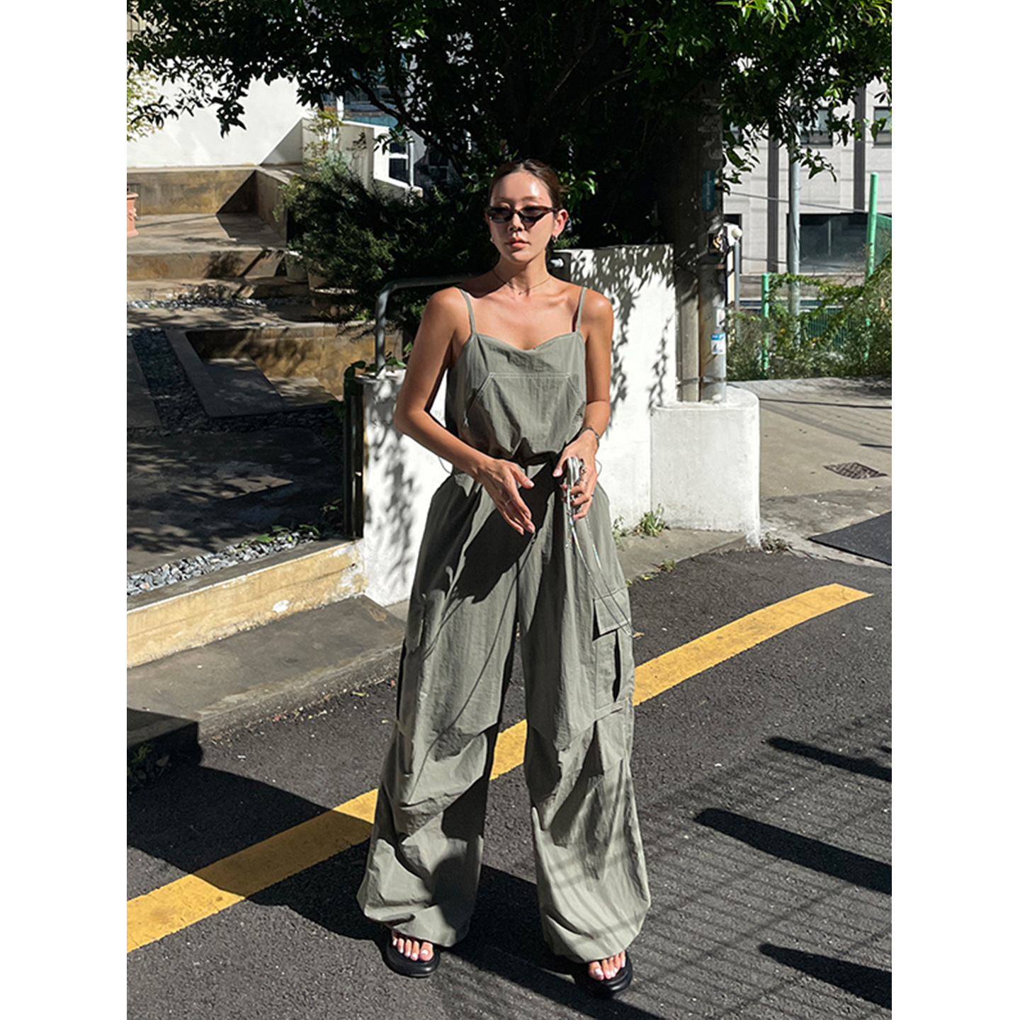 鬼鬼家正品韩代东大门秋 纯色宽松收腰大口袋吊带工装连体裤长裤