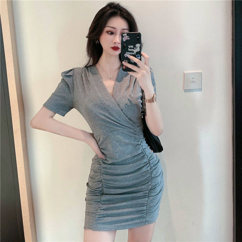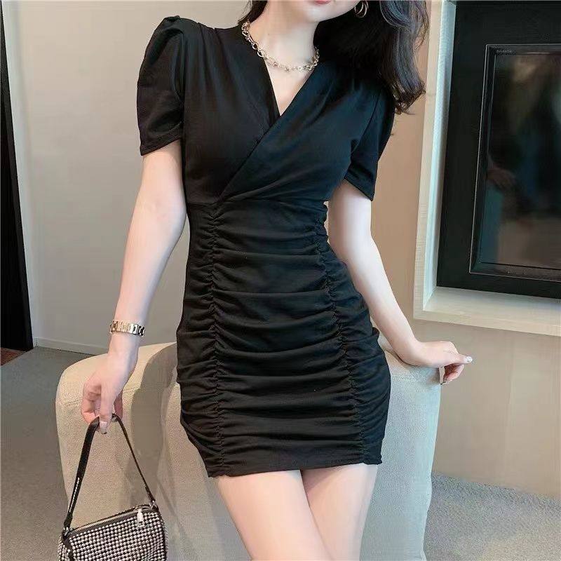 V领修身黑色短袖连衣裙女2022年夏季新款包臀短裙辣妹气质裙子
