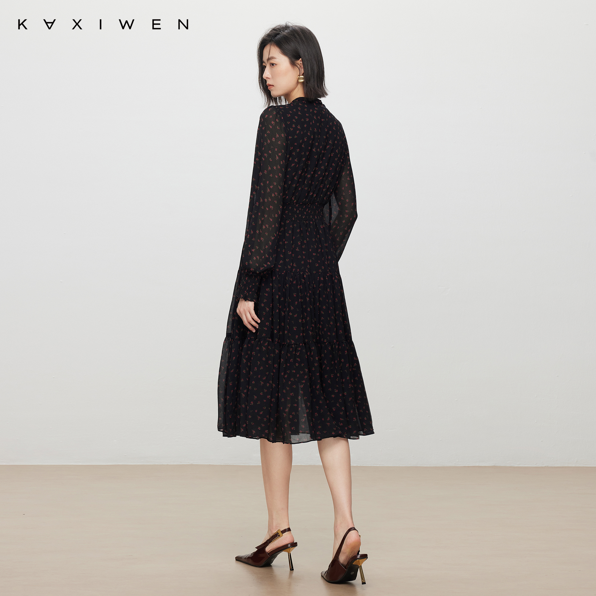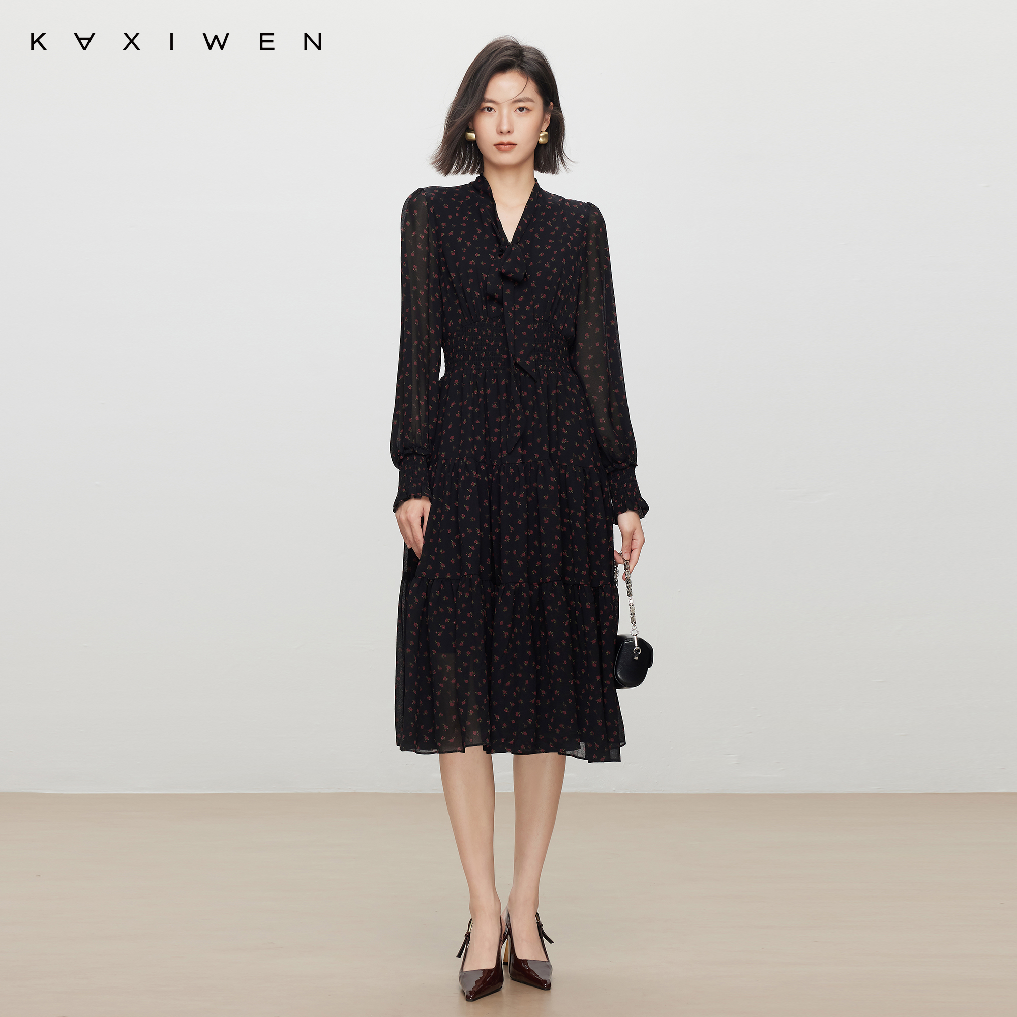 佧茜文浪漫雪纺碎花连衣裙潮流秋季新款V领系带中长款蛋糕裙女