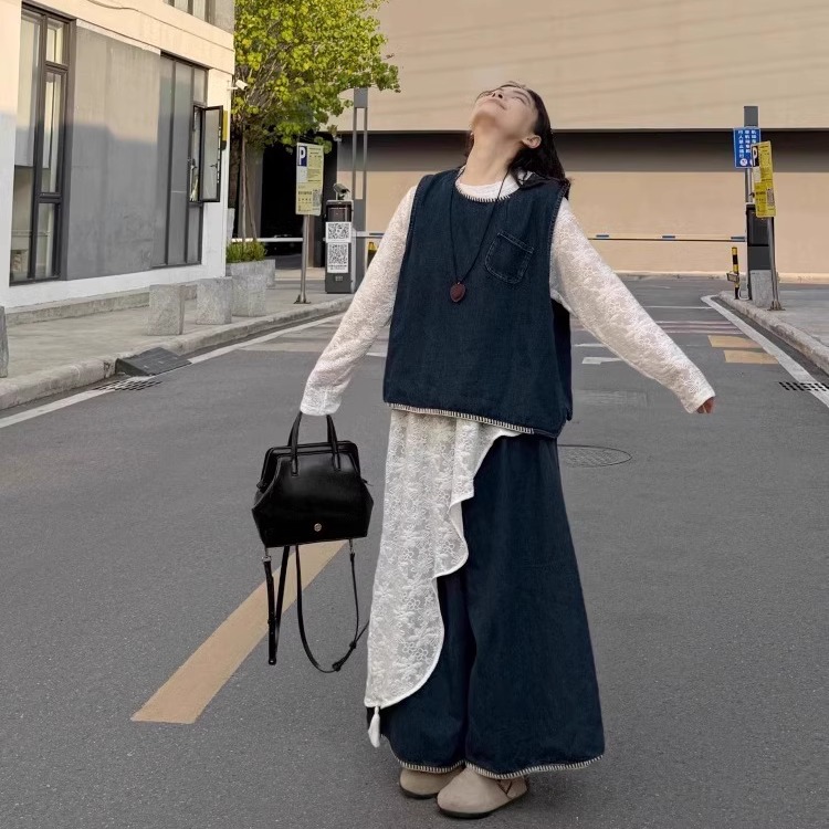 一整套ootd日系复古牛仔马甲设计感叠穿内搭不规则半身裙套装女春