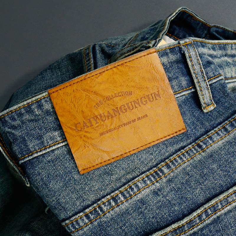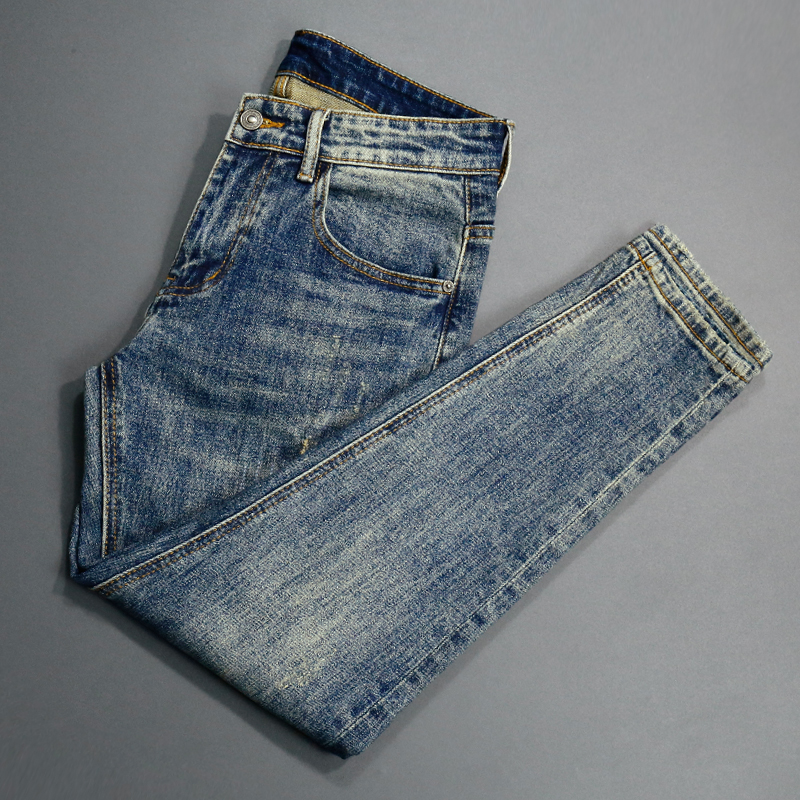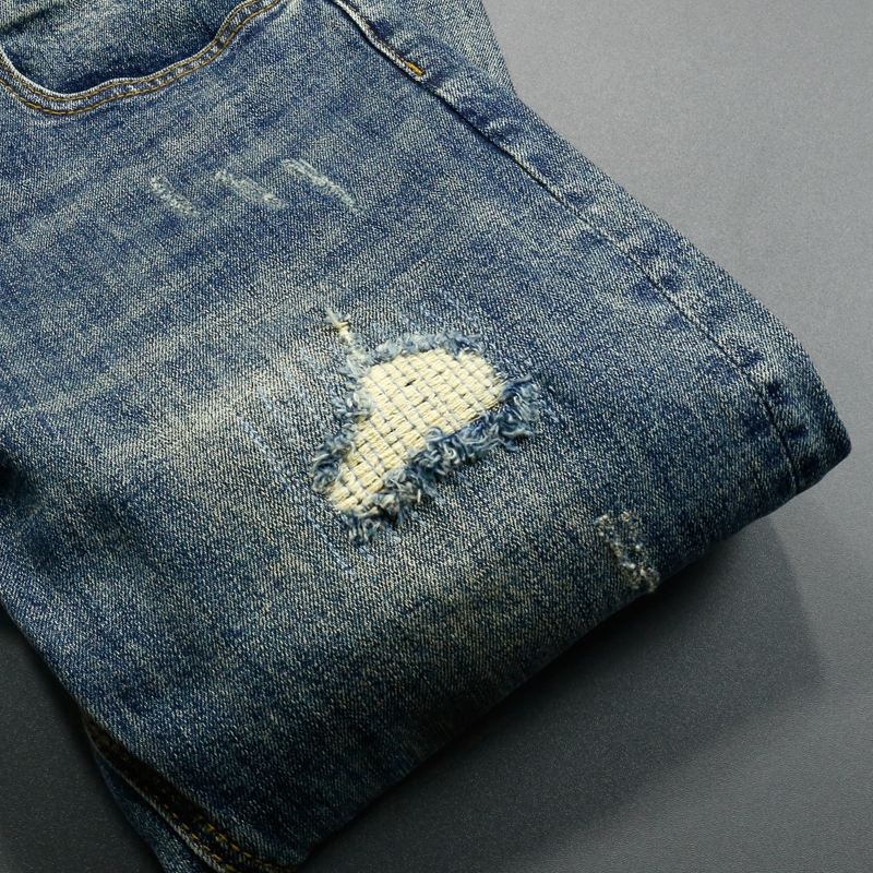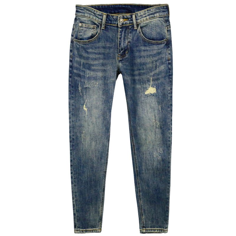 九分牛仔裤男士韩版新款复古蓝色潮流猫须补丁做旧弹力修身小脚裤
