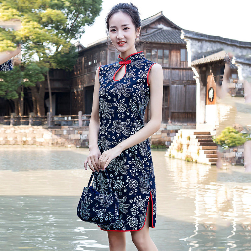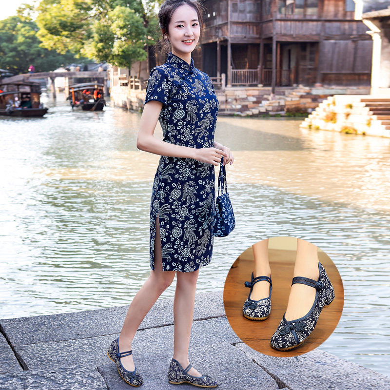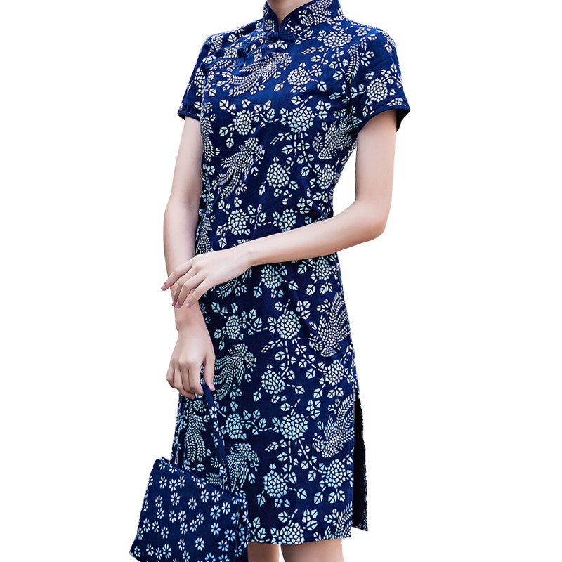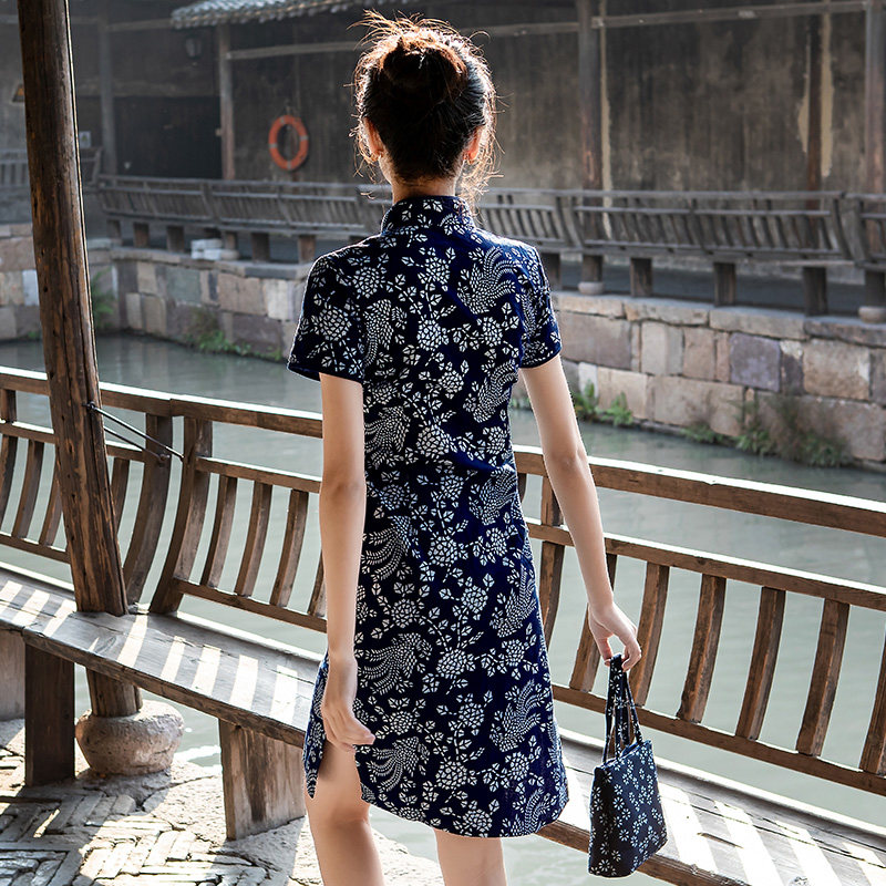 乌镇手工蓝印花布短袖旗袍复古修身民族风纯棉女装立领中长款旗袍
