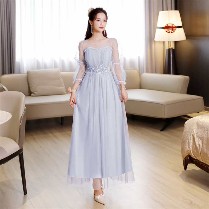 拉链泡袖修身中长款刺绣伴娘服