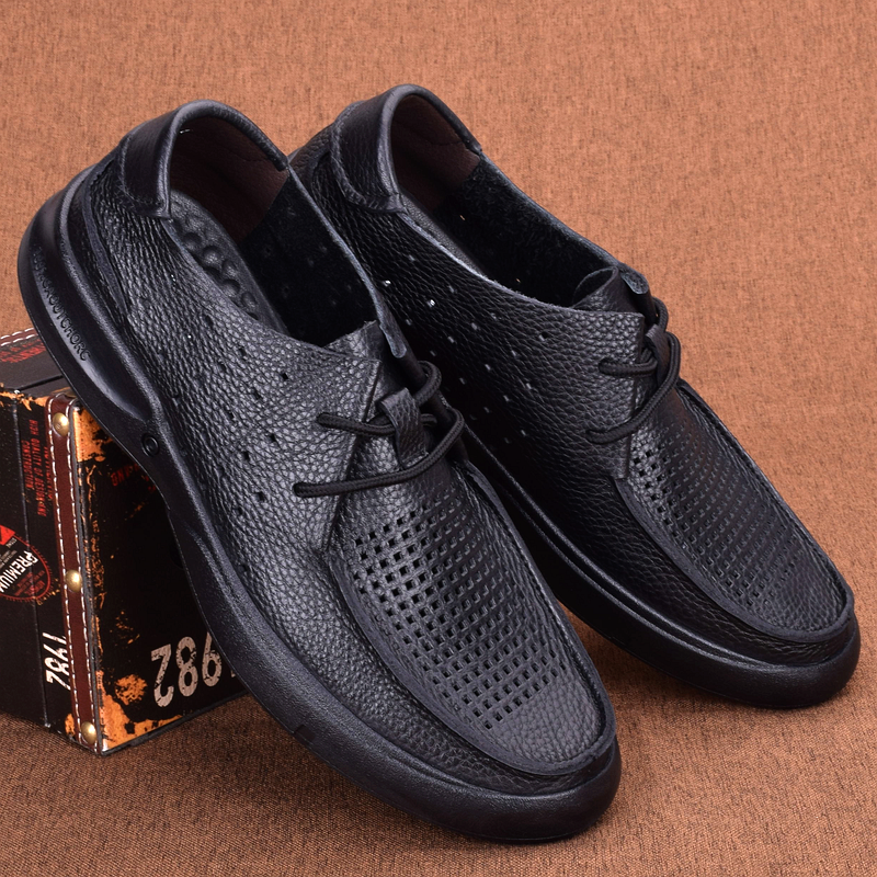 男士镂空皮鞋夏季新款外贸真皮男鞋打孔透气休闲皮凉鞋系带洞洞鞋