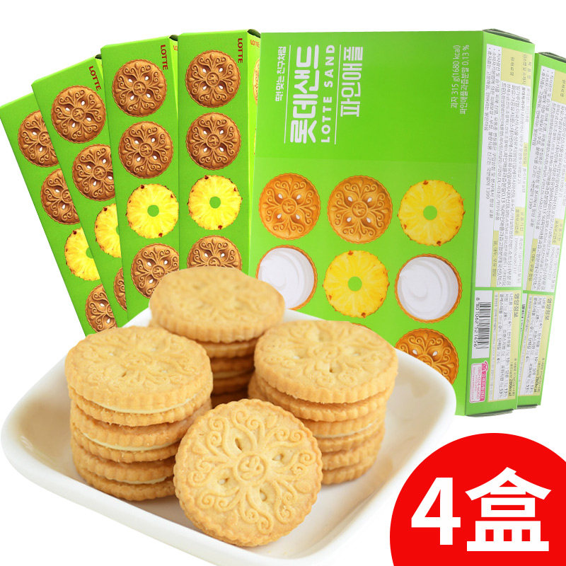 韩国进口乐天菠萝味夹心饼干105g*4盒早餐牛奶搭配休闲办公零食品