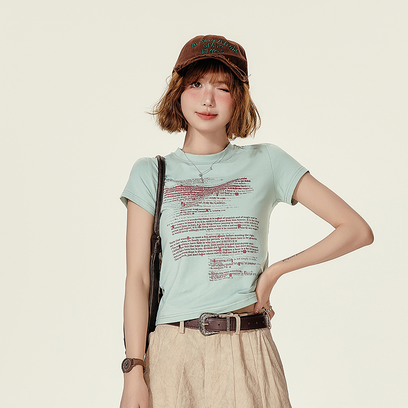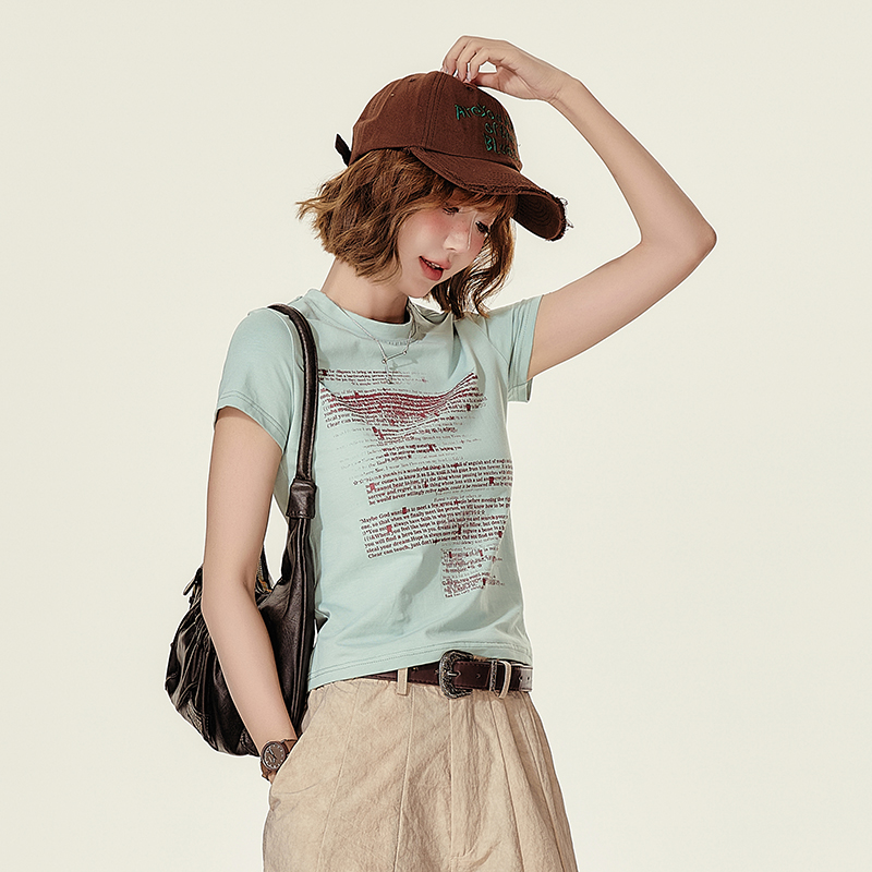 Girlyhalo美式复古正肩短袖t恤女夏季新款字母印花短袖修身上衣