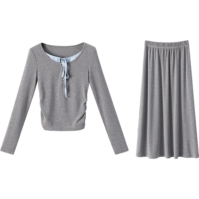 【直降清仓】春韩系时尚小众小个子独特修身灰色t恤半身裙套装女