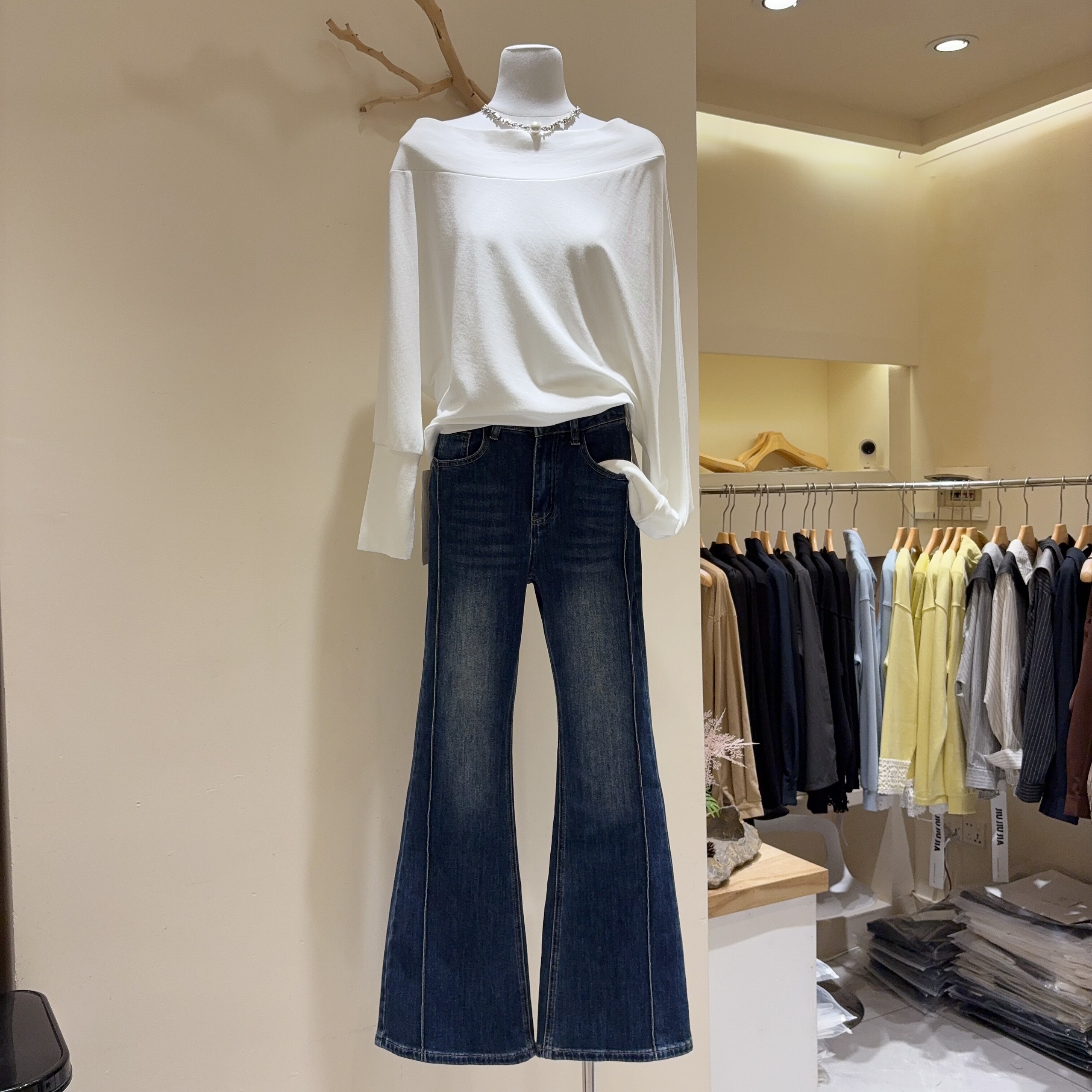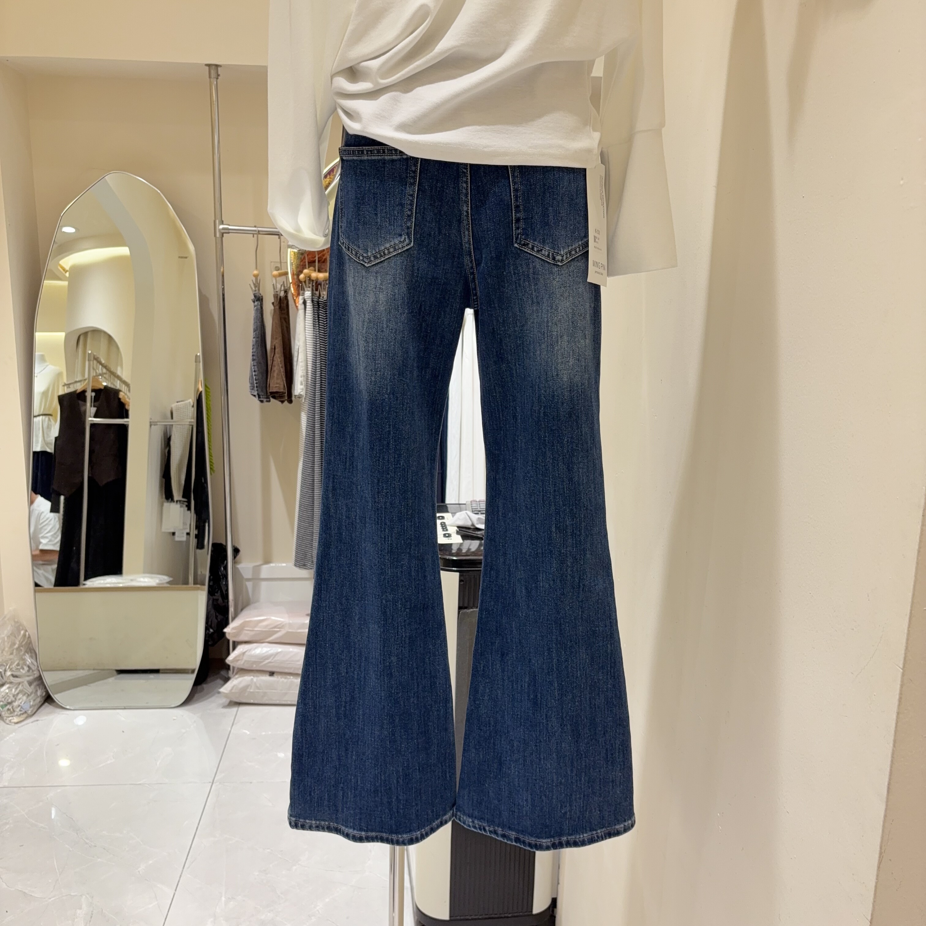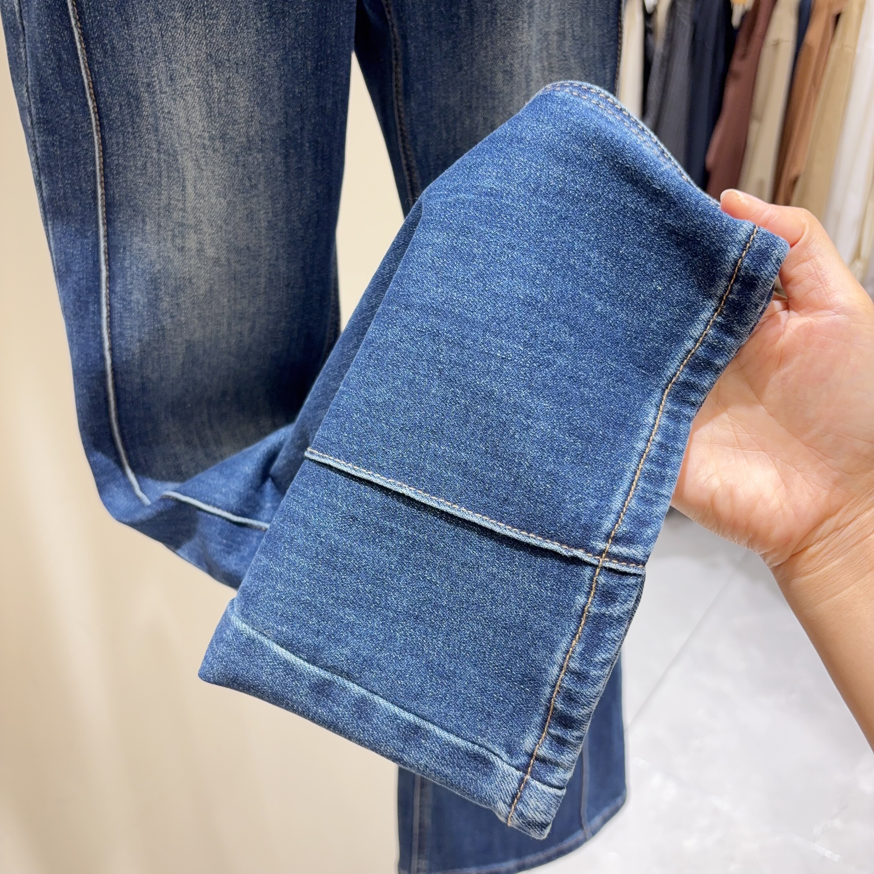美式牛仔微喇裤女蓝色高腰弹力修身马蹄长裤拼接设计直筒喇叭裤子