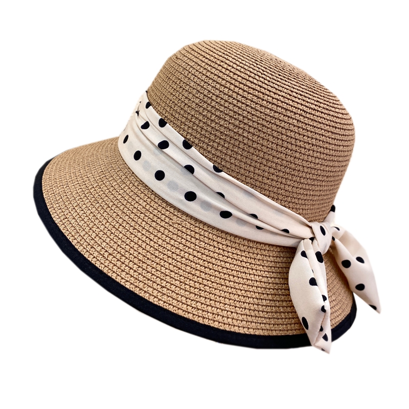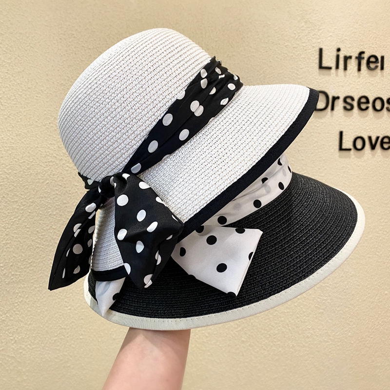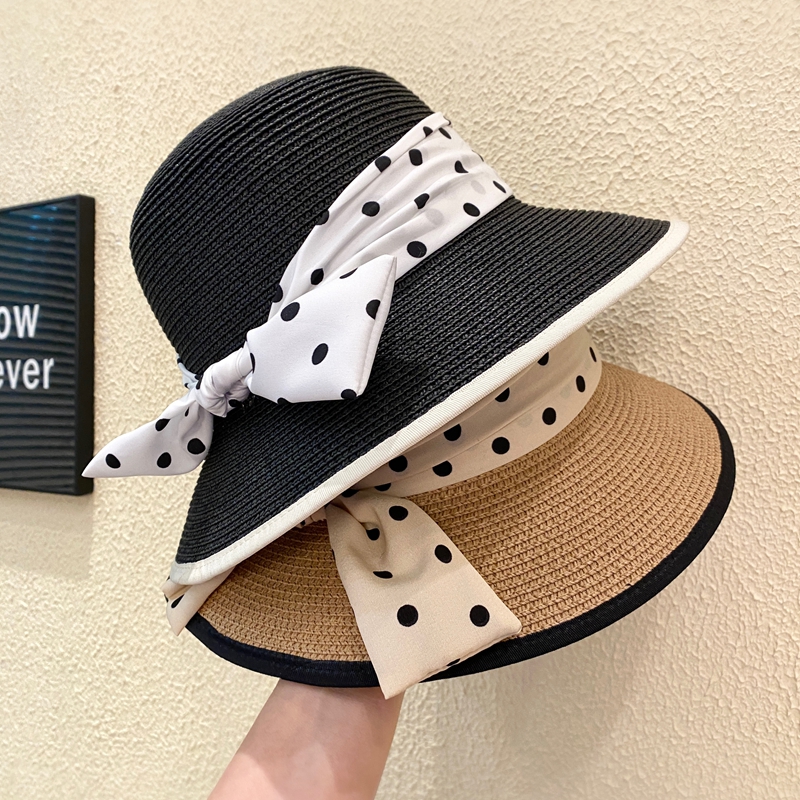 法式复古优雅波点蝴蝶结草帽女夏