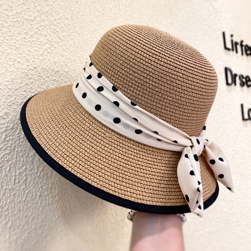 法式复古气质波点蝴蝶结草帽女春夏季海边度假沙滩遮阳盆帽渔夫帽