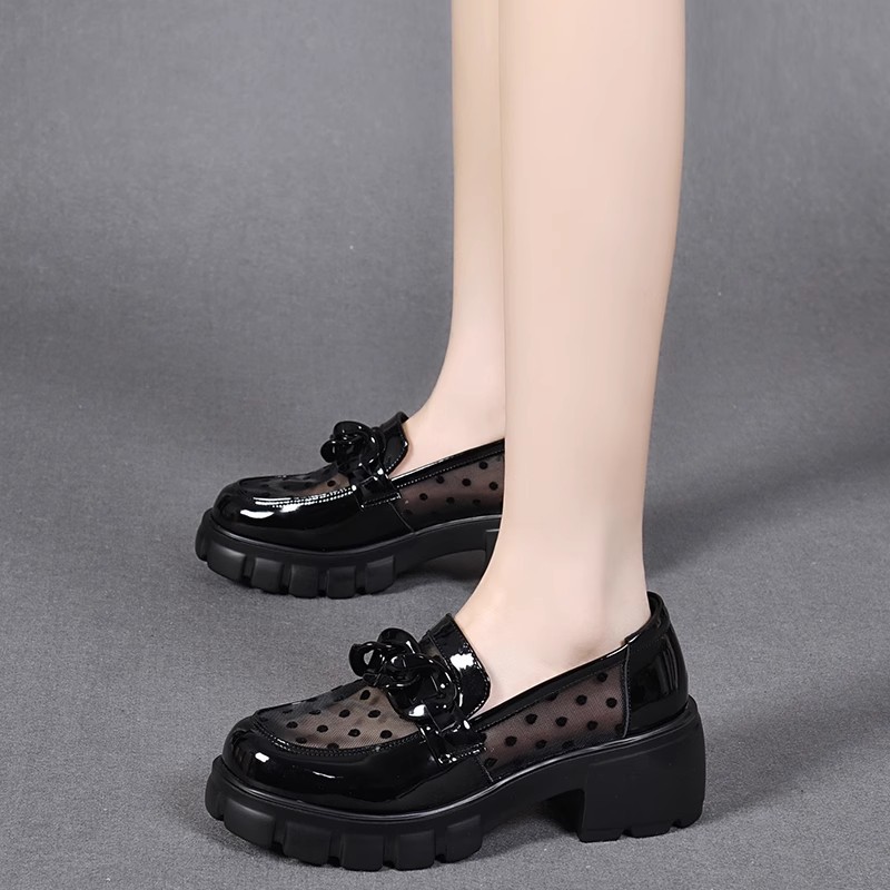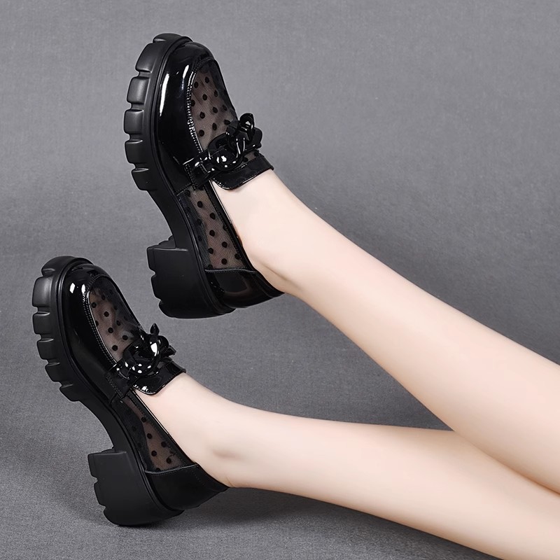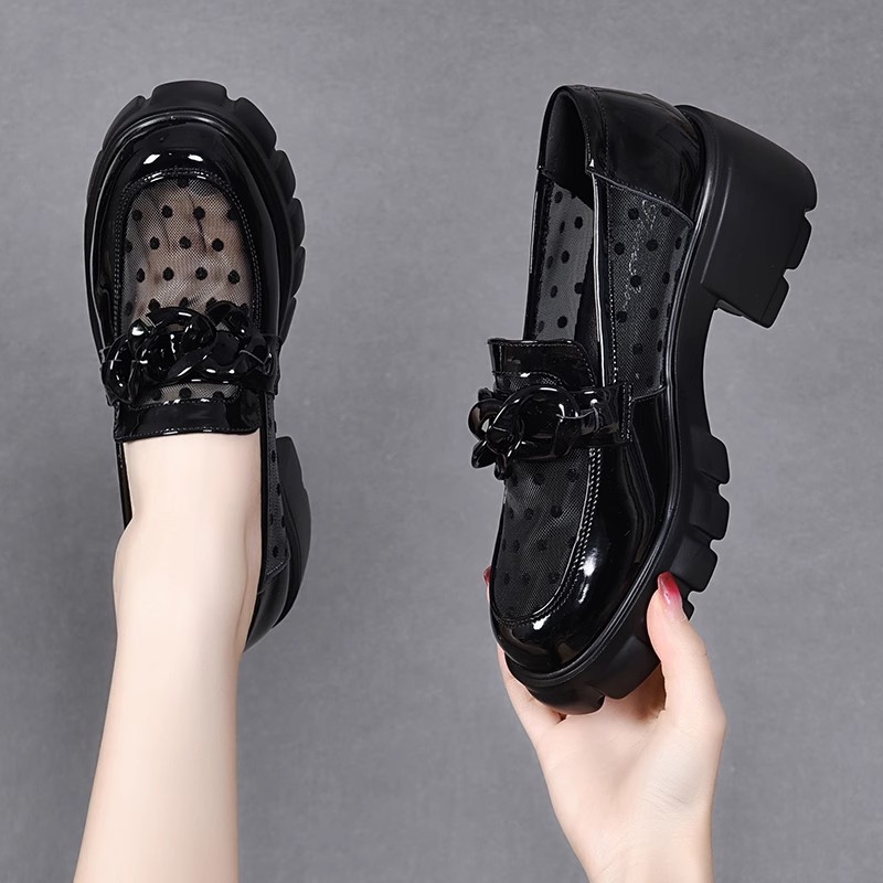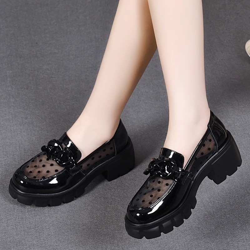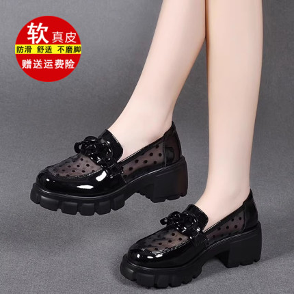 品牌薏尔康漆皮乐福鞋女2025新款夏季松糕厚底一脚蹬真皮网纱单鞋