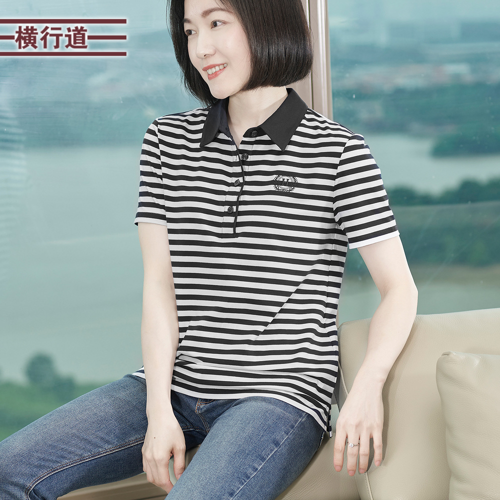 上衣刺绣t恤女装翻领黑白条纹宽松短袖2025夏装新款打底衫半袖