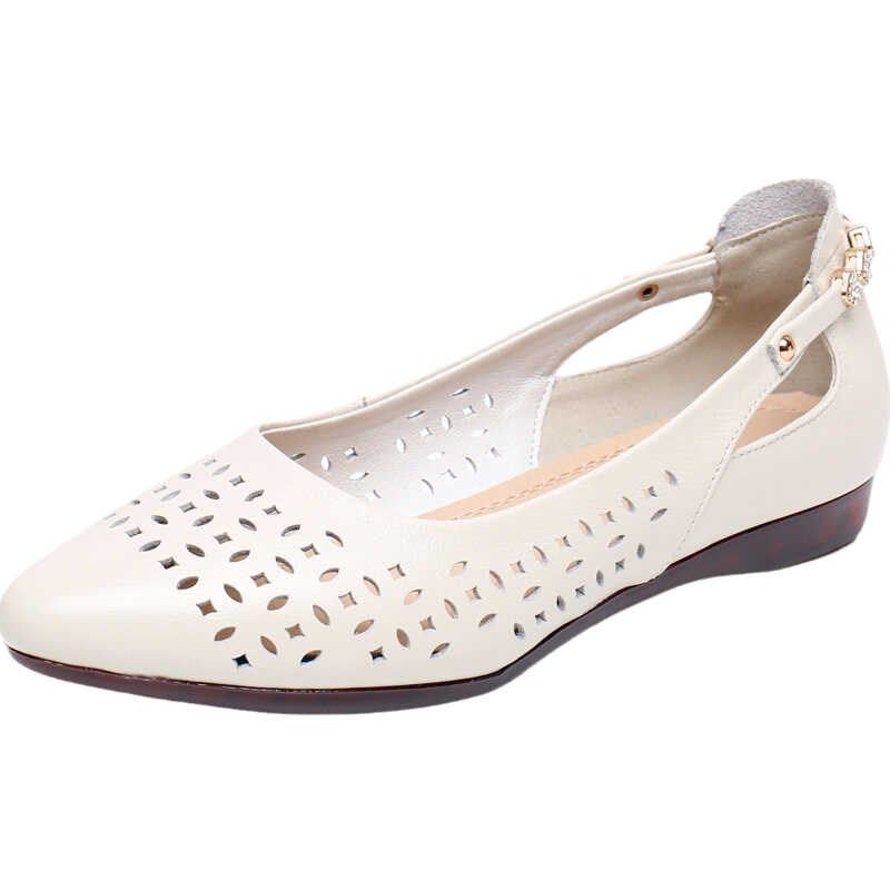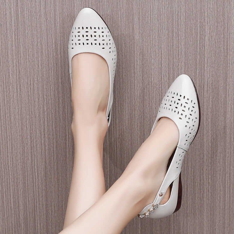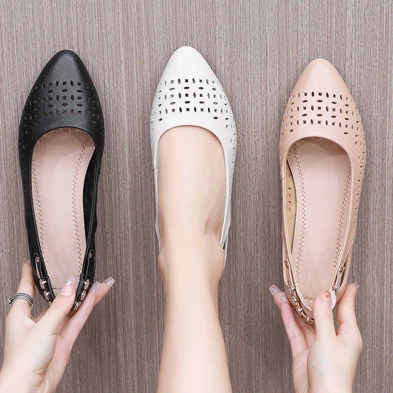 夏季尖头镂空凉鞋真皮妈妈鞋软皮软底单鞋女平底大码中老年洞洞鞋