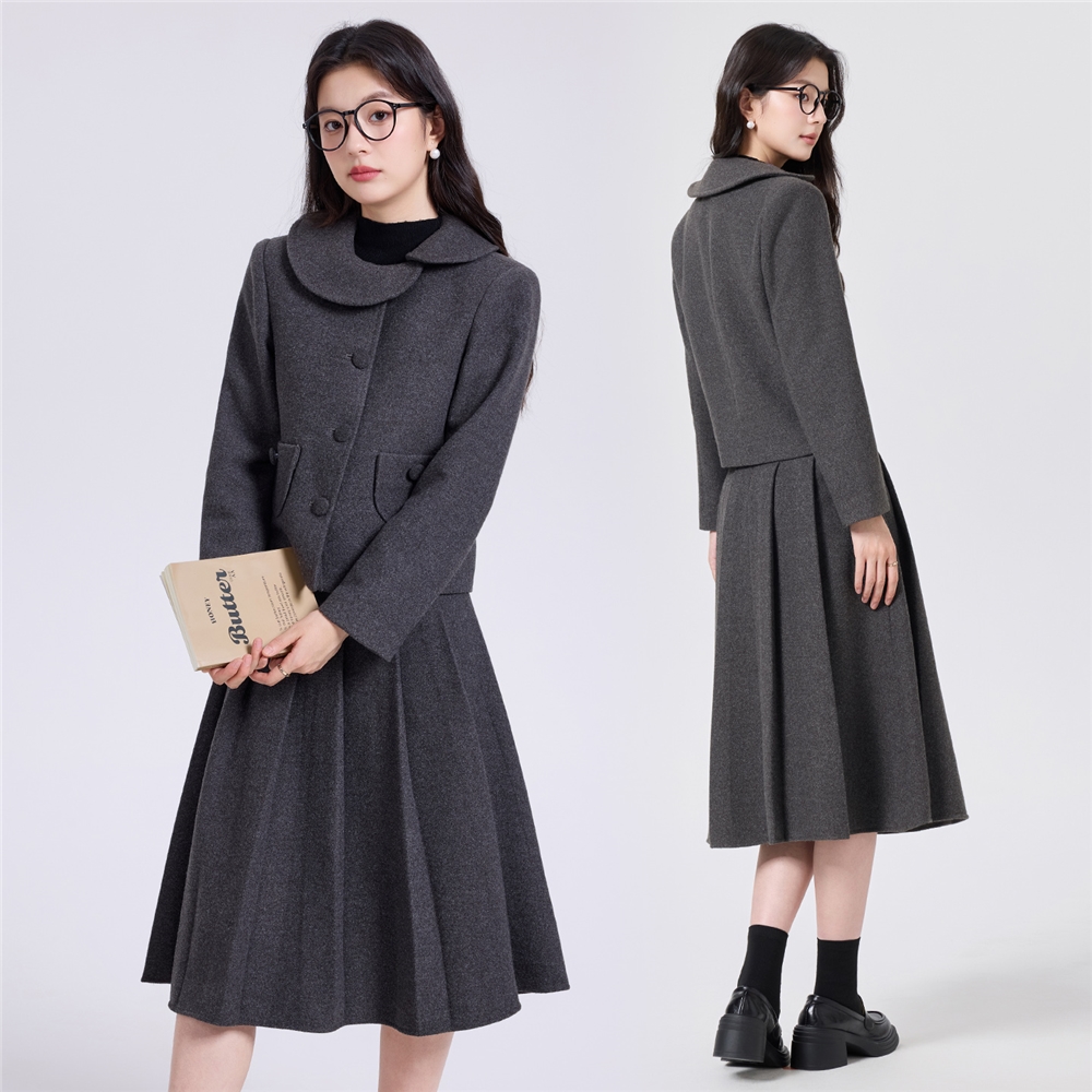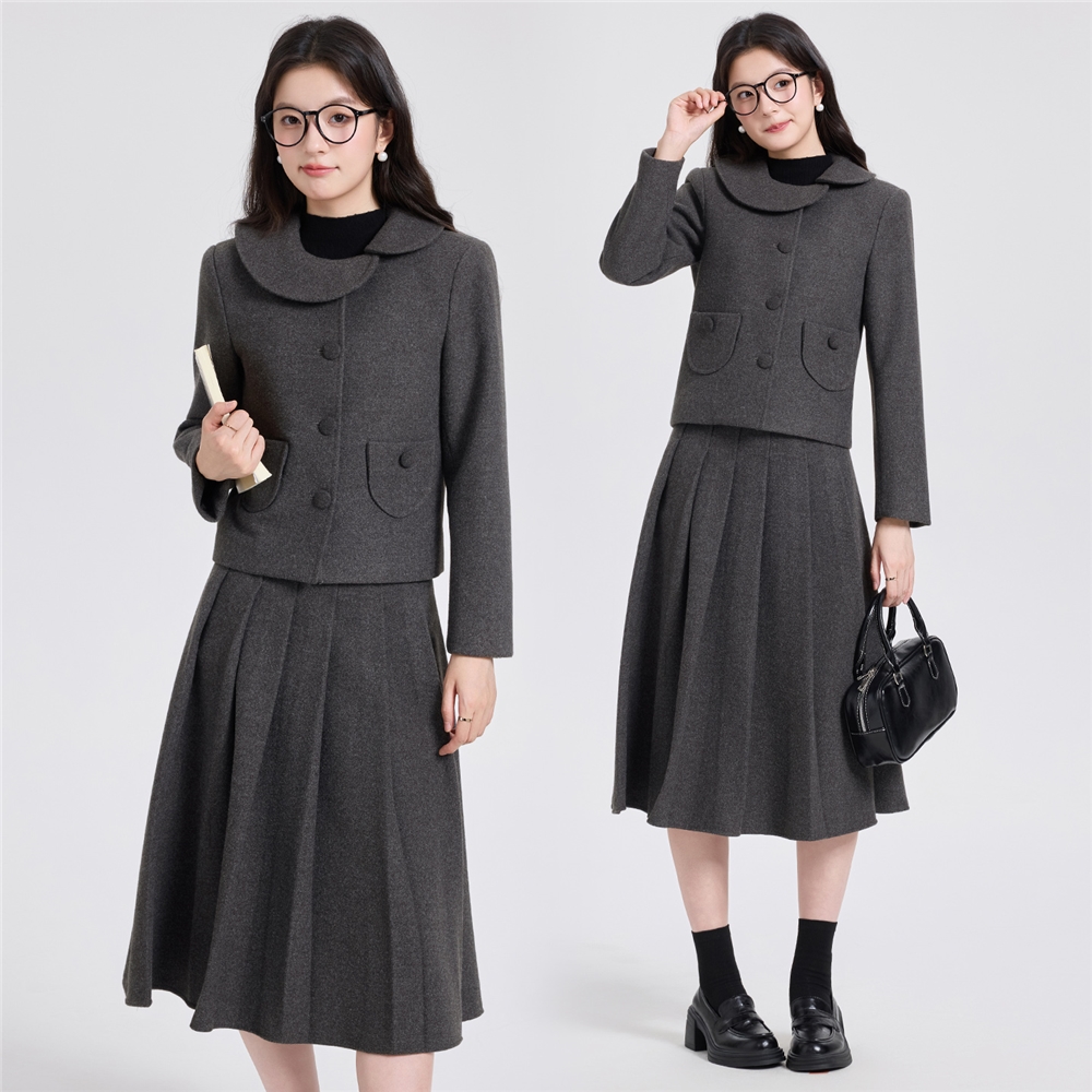 2025秋冬新款学院风气质短款小外套百褶裙加厚毛呢简约两件套女