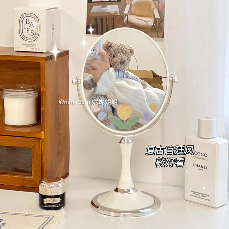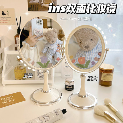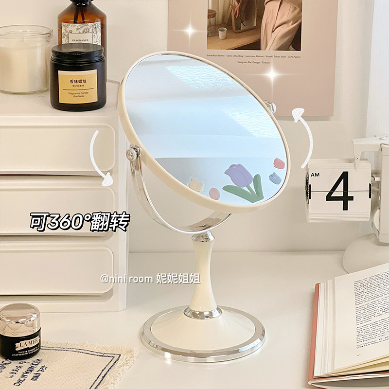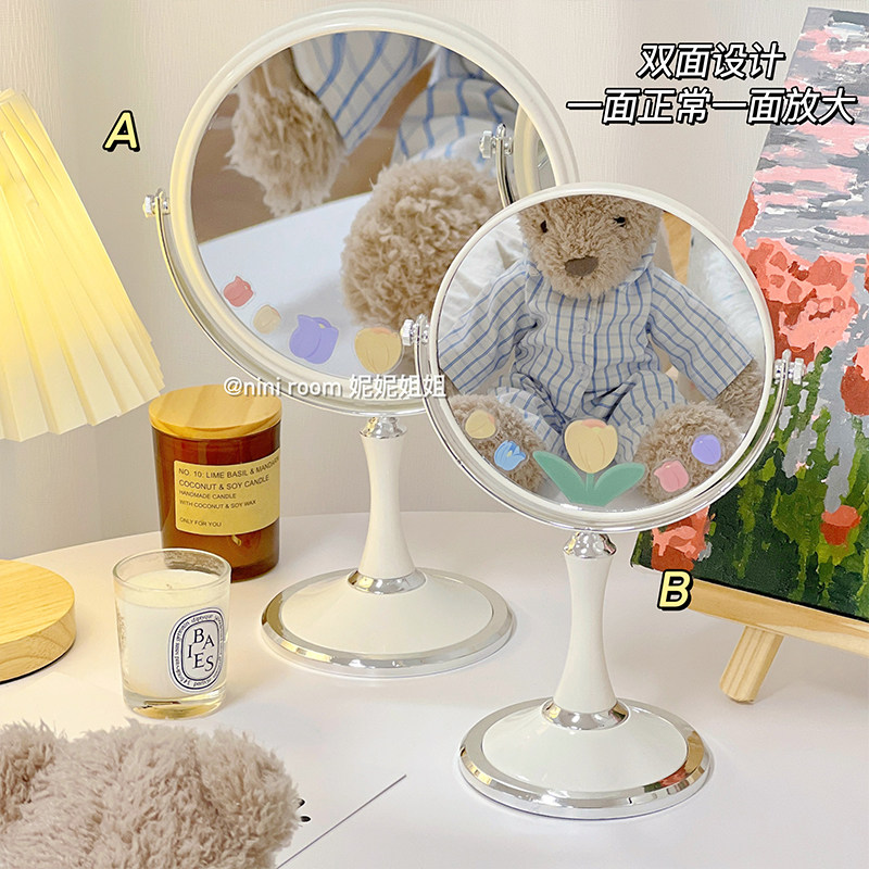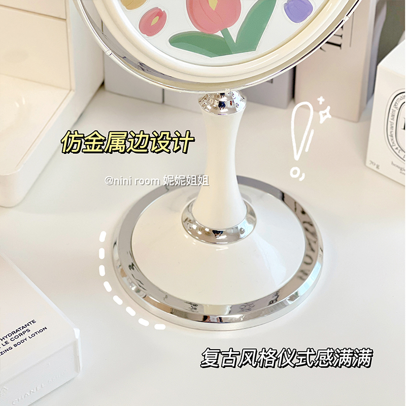 ins风花朵双面化妆镜复古桌面圆形台式梳妆台镜子简约卧室梳妆镜