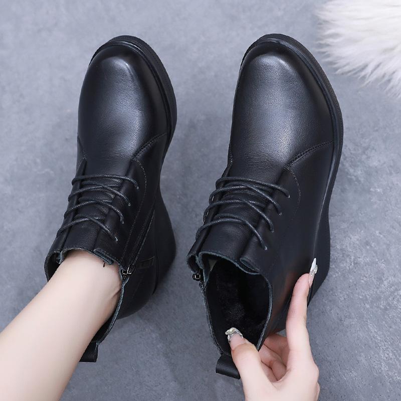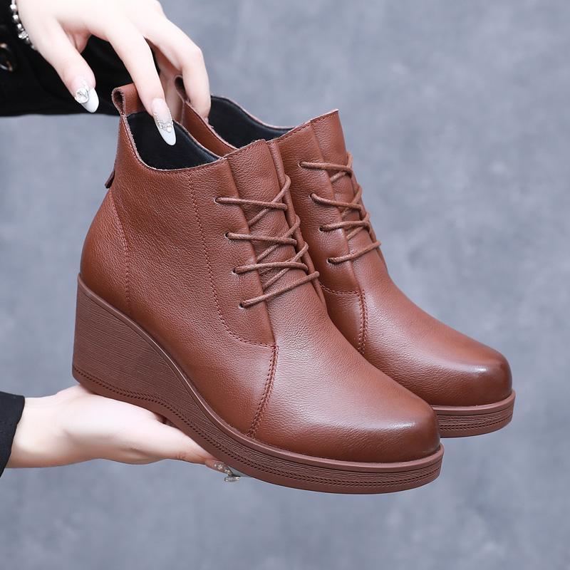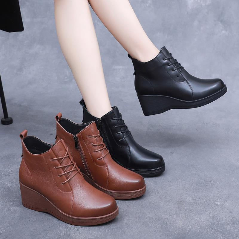 真皮坡跟短靴女士高跟休闲马丁靴女鞋春秋单鞋踝靴子冬季加绒皮鞋