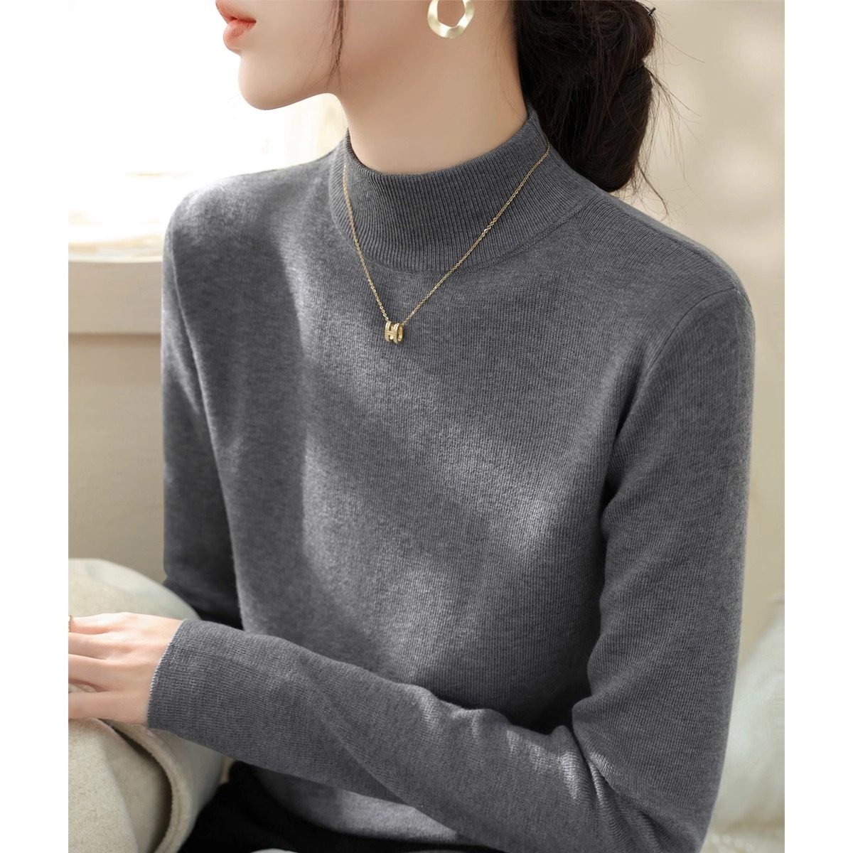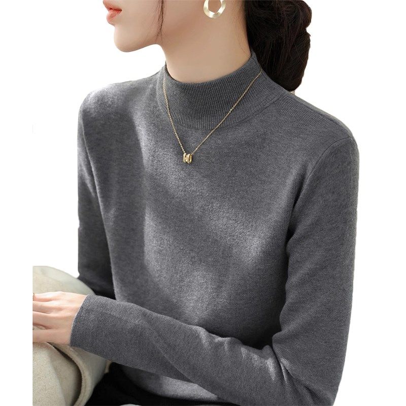法式秋冬新款高级感灰色羊毛半高领修身长袖针织打底衫女内搭毛衣