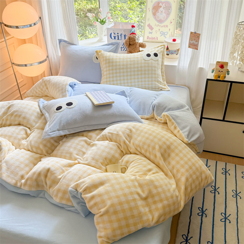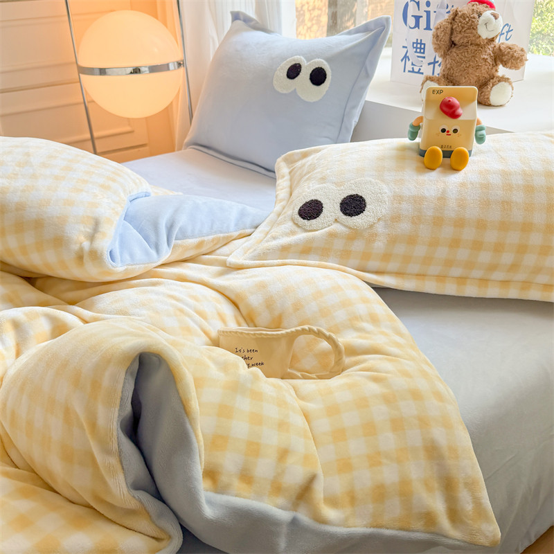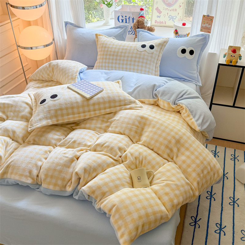 秋冬天多巴胺大眼睛牛奶绒四件套珊瑚加绒被套宿舍床单加绒三件套
