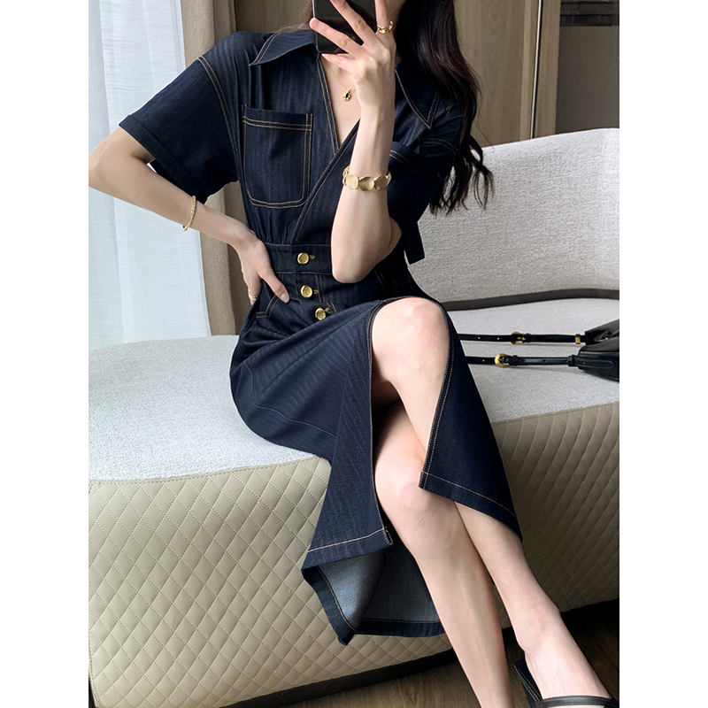 速发FT GUOGE牛仔连衣裙202款高级感复古收腰气质通勤长裙
