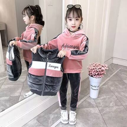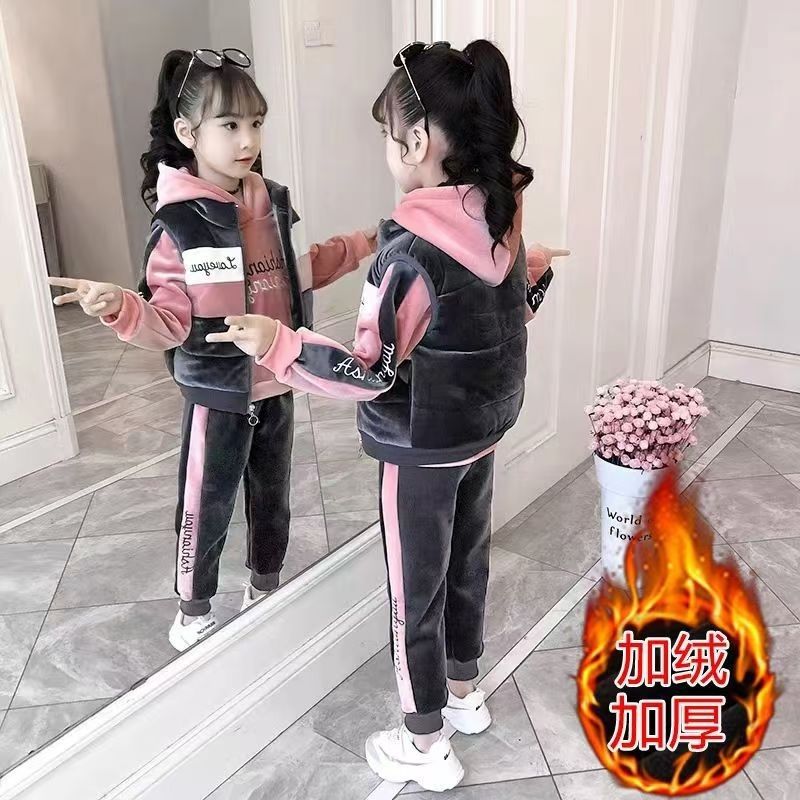 女童秋冬套装2025新款加绒加厚卫衣三件套中大童韩版双面绒儿童