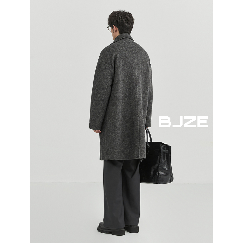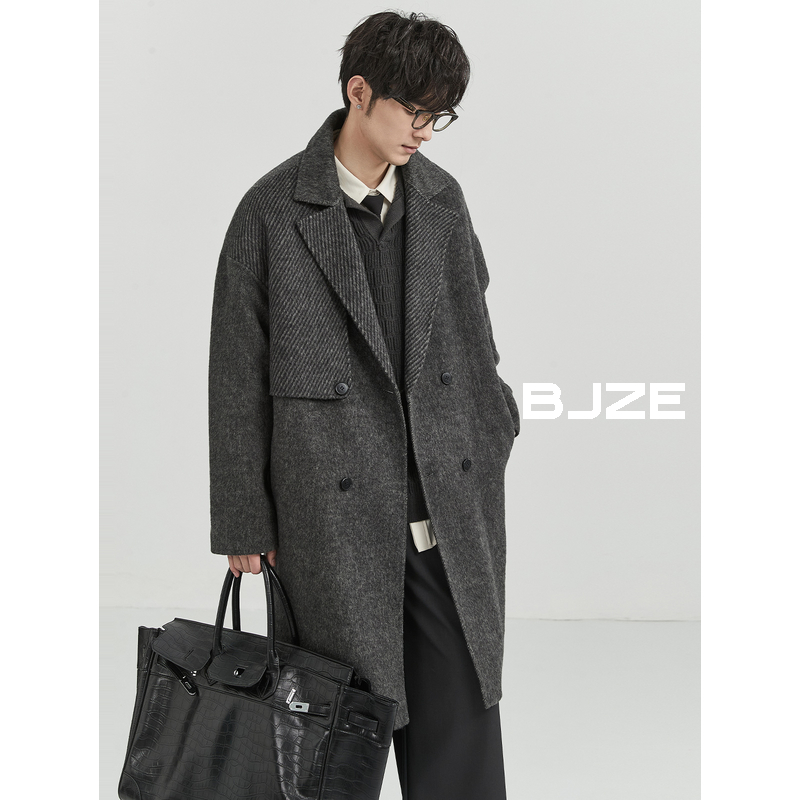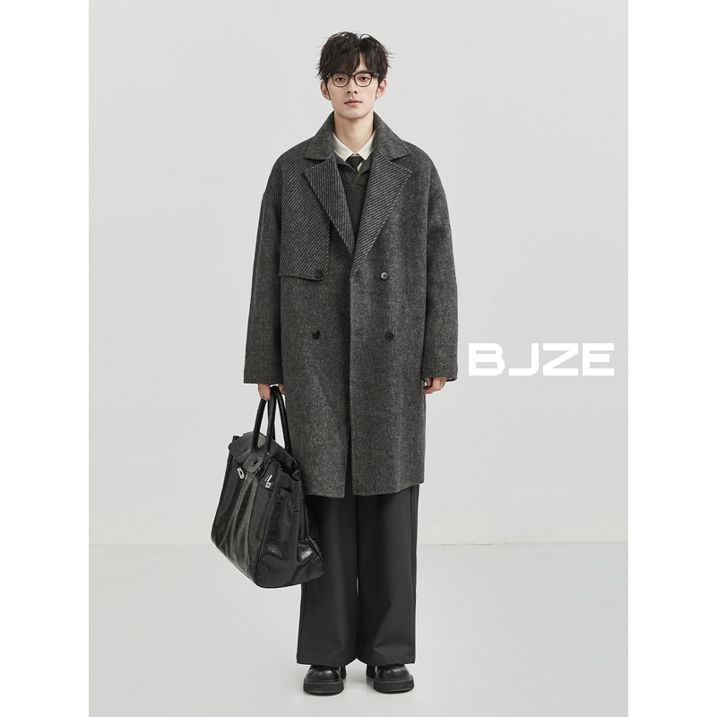 BJZE男装24冬季高端定织斜纹拼接骆驼绒双面羊毛呢子大衣宽松外套