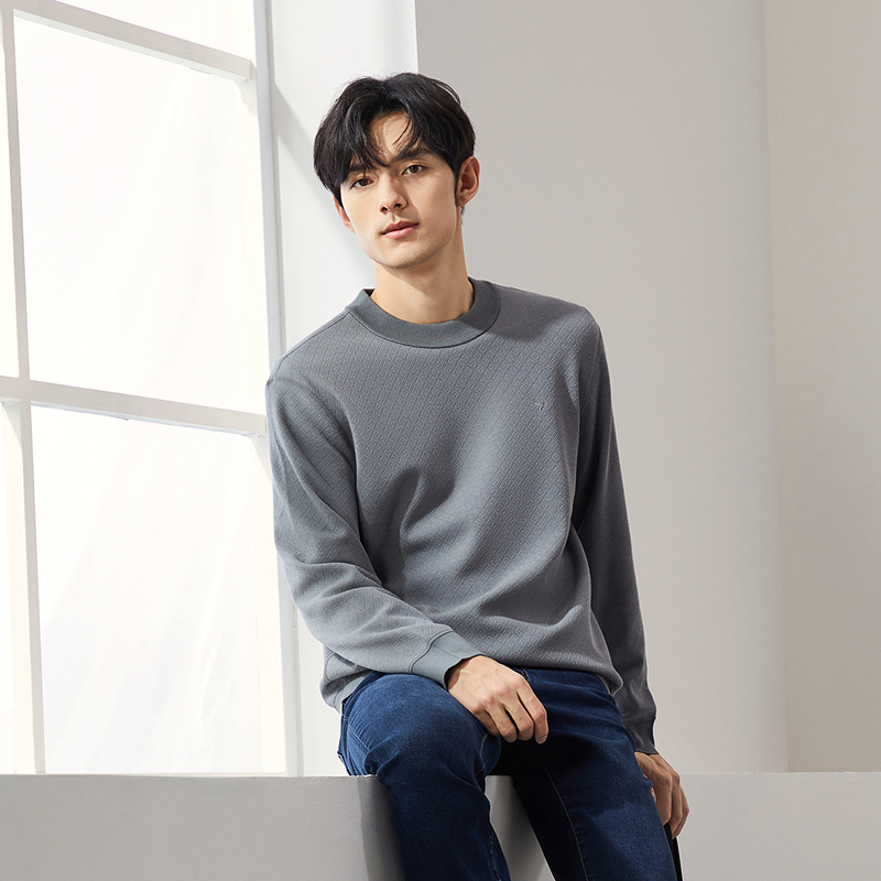 【含羊毛】柒牌加绒卫衣男舒适厚款时尚休闲几何提花圆领上衣