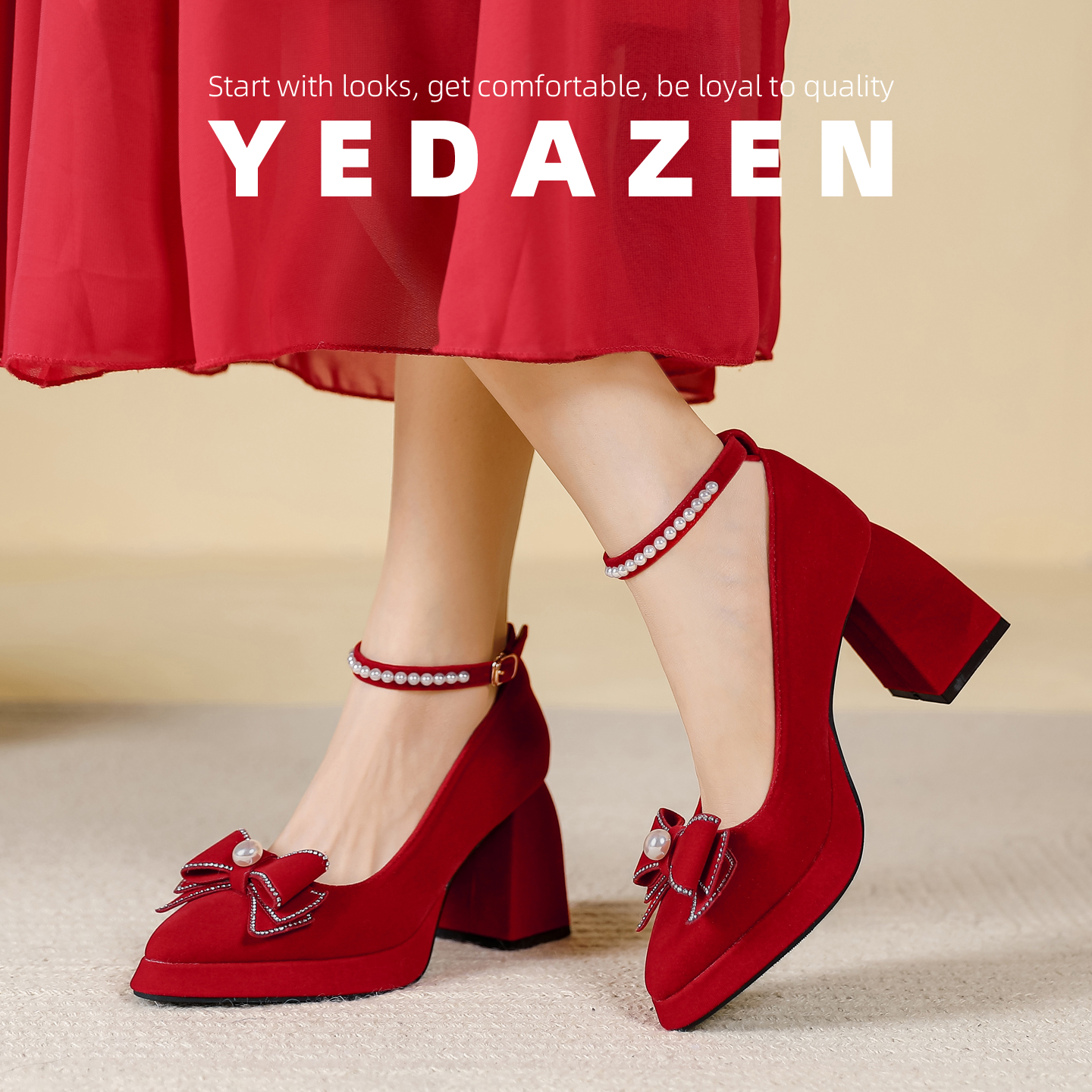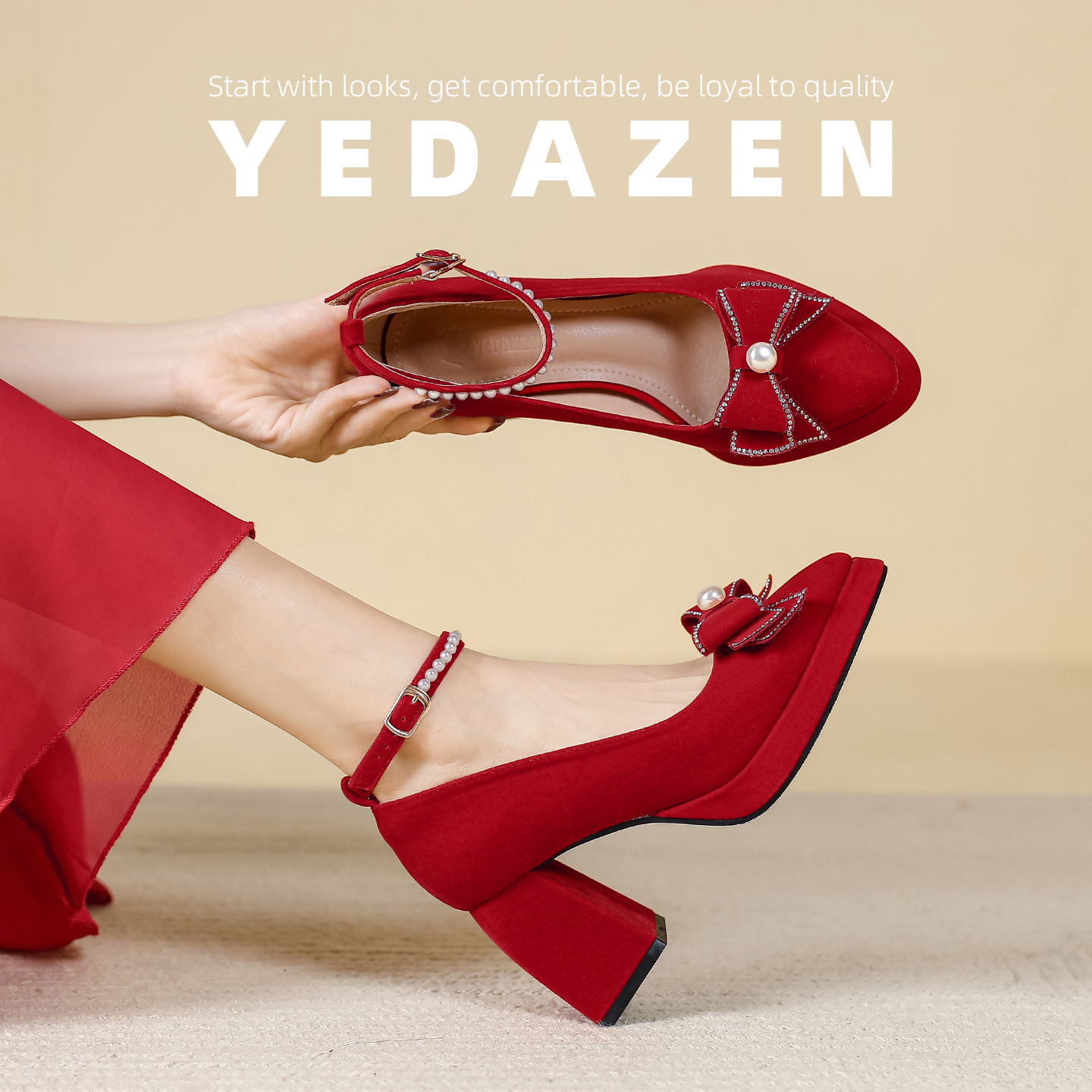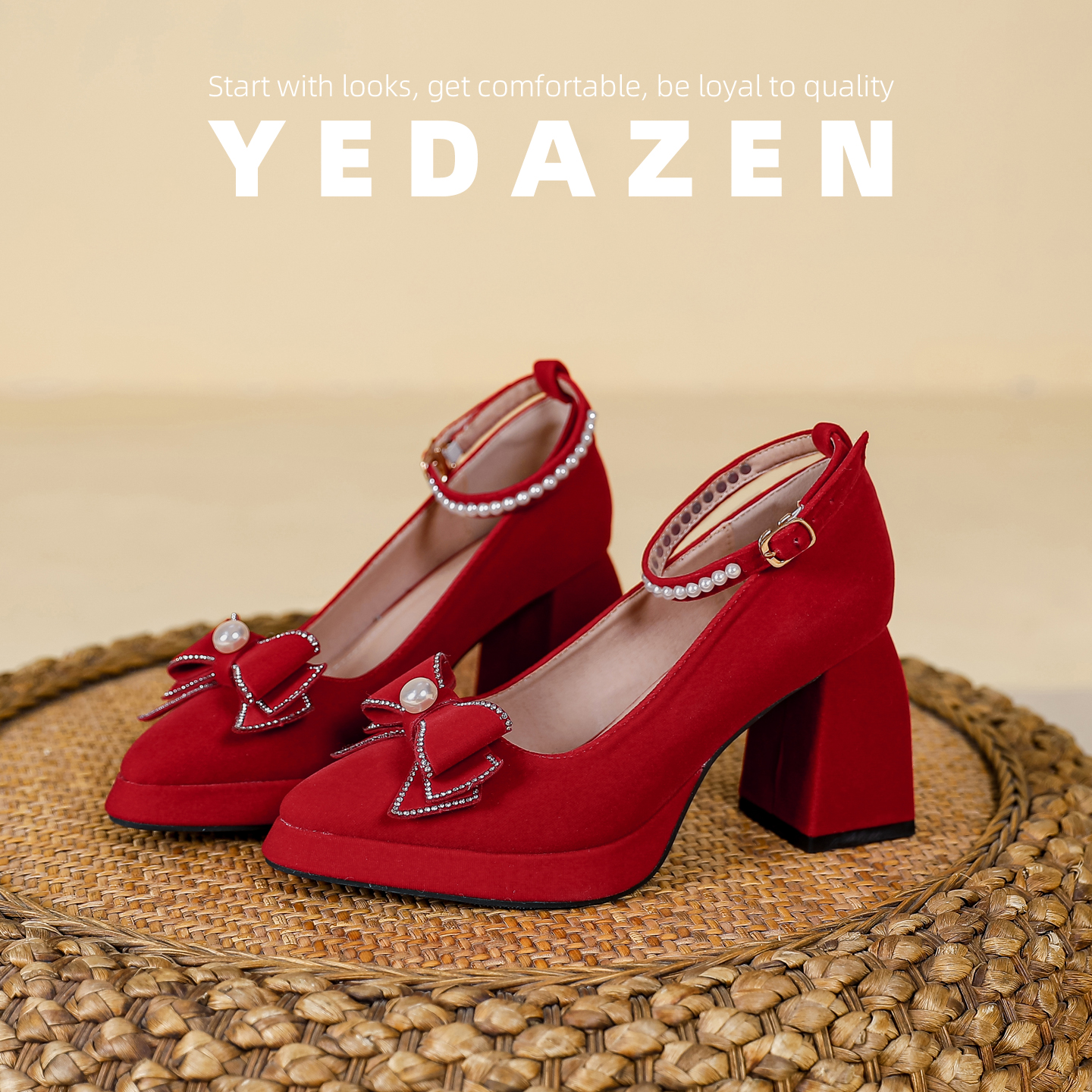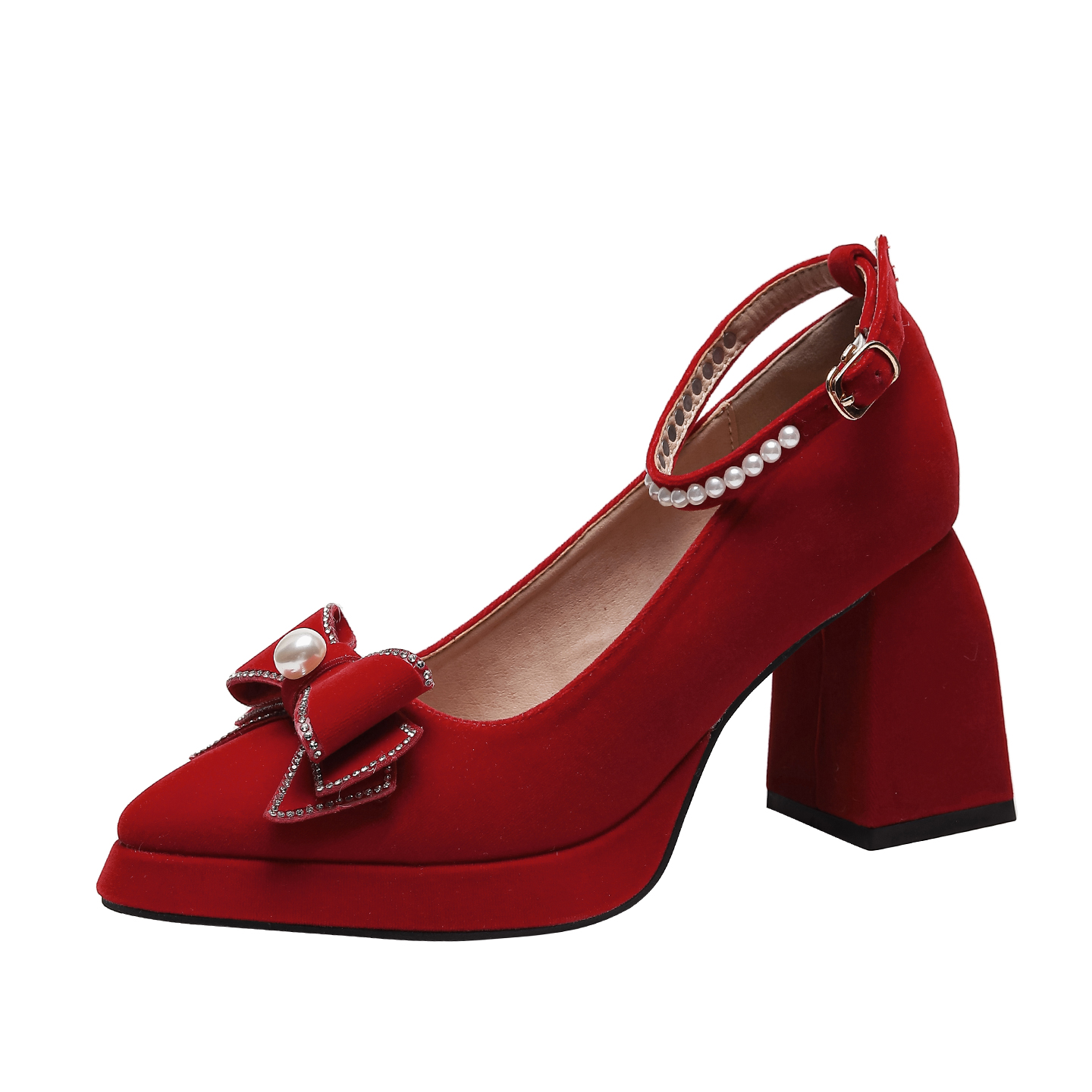 红色尖头蝴蝶结高跟鞋女粗跟防水台绝美绒面秀禾敬酒服婚鞋新娘鞋