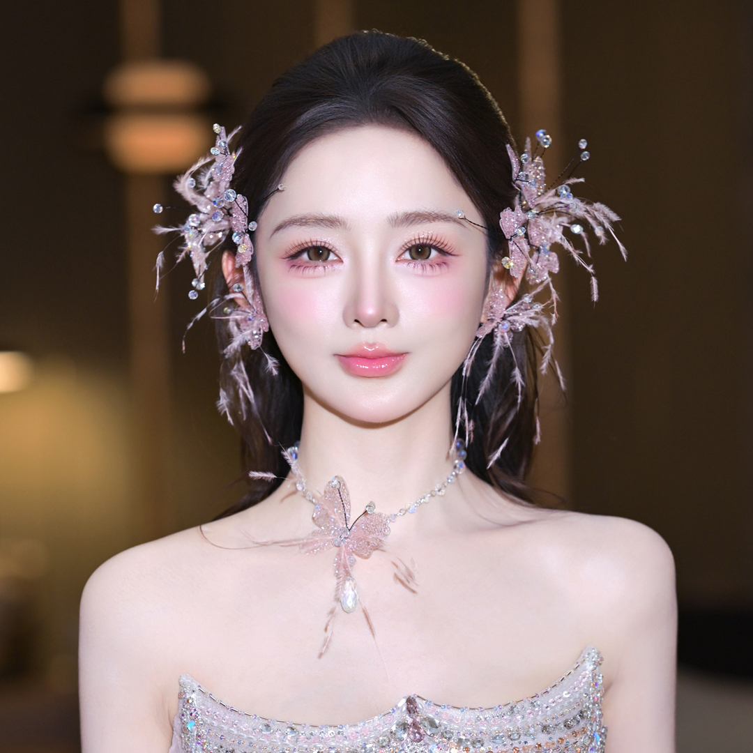水舞A5282甜美粉色水晶串珠蝴蝶新娘发饰颈链婚纱礼服跟妆配饰