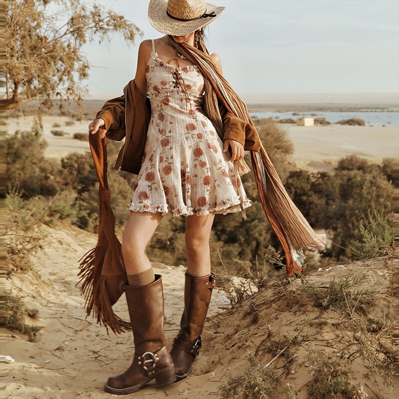 麦叙原创《桃乐丝》复古纯欲辣妹风蕾丝印花绑带吊带短裙连衣裙夏