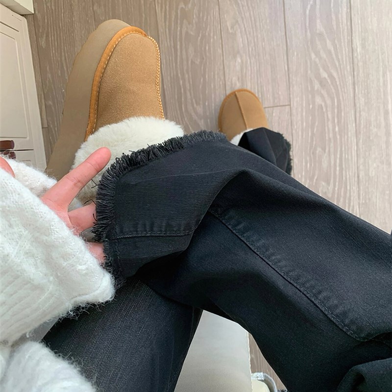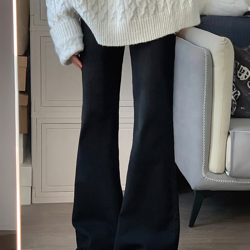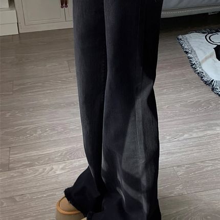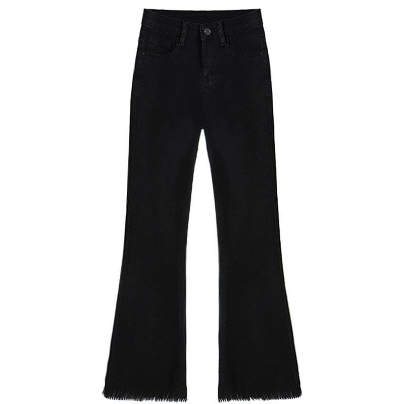 黑色微喇毛边牛仔裤女夏季新款胖妹妹mm高腰弹力显瘦梨形身材裤子