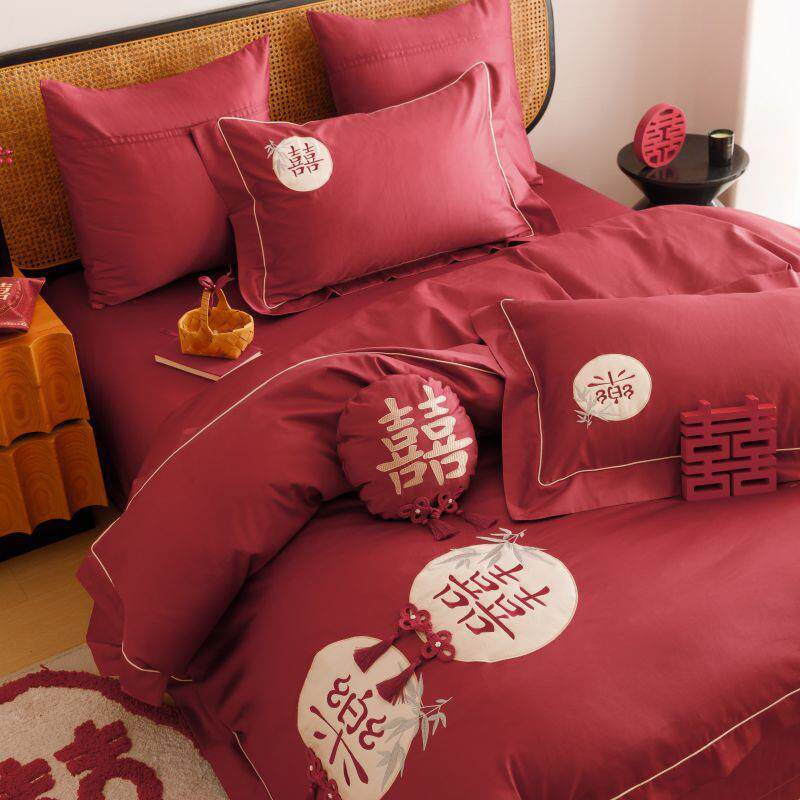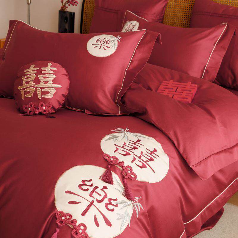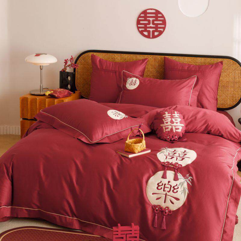 新中式婚庆100支长绒棉四件套全棉床单红色被套纯棉结婚陪嫁喜被