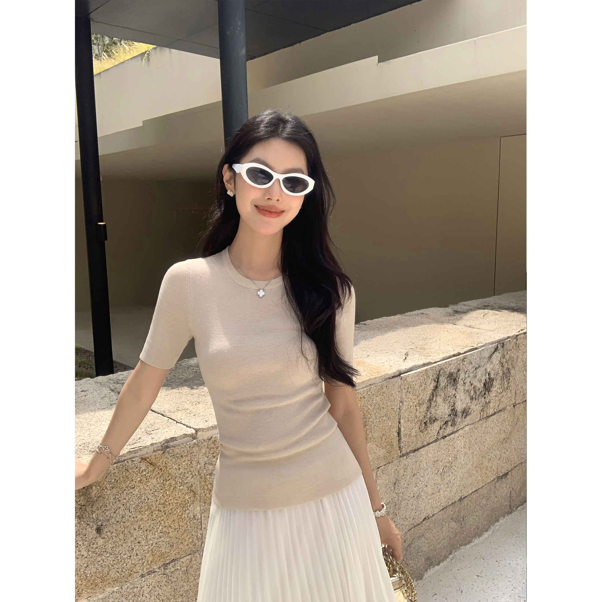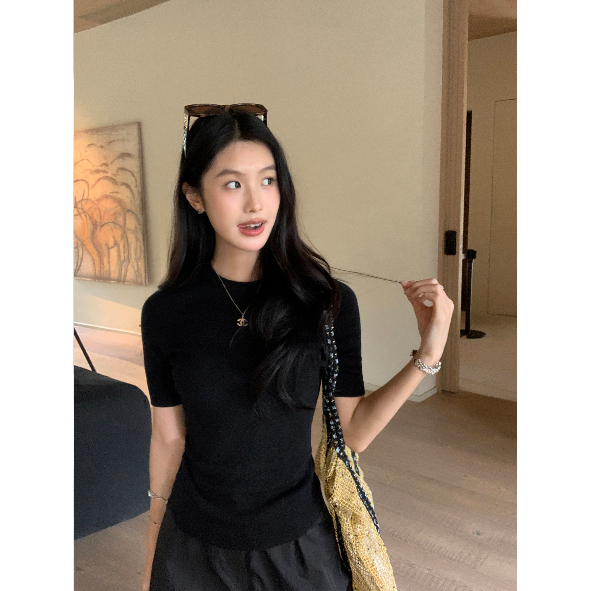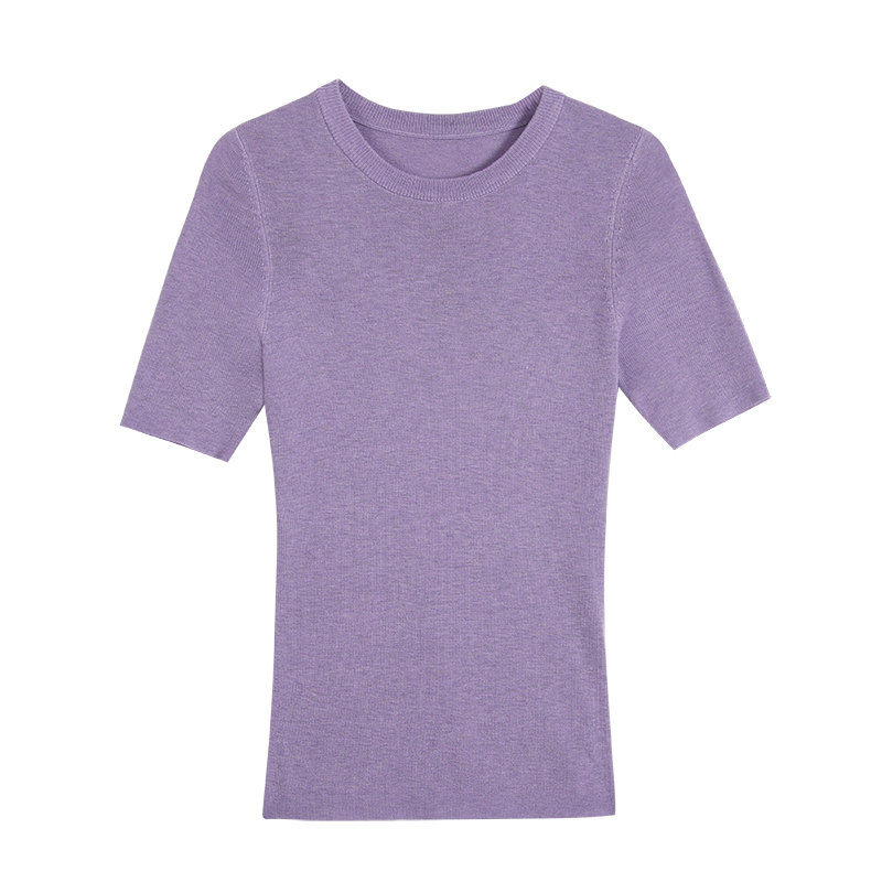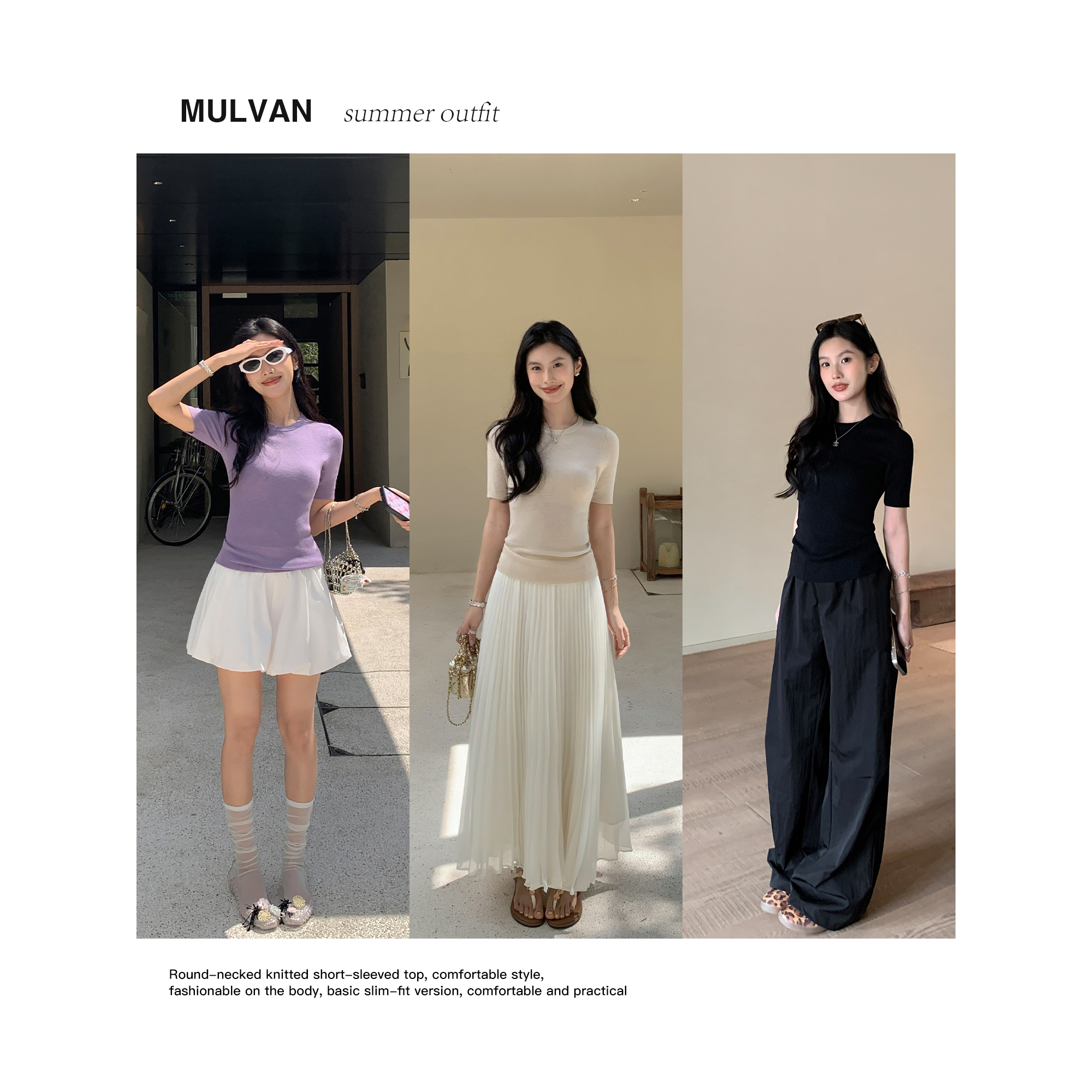 MULVAN 基础百搭 薄款针织中袖上衣修身短款女韩系圆领t恤打底衫