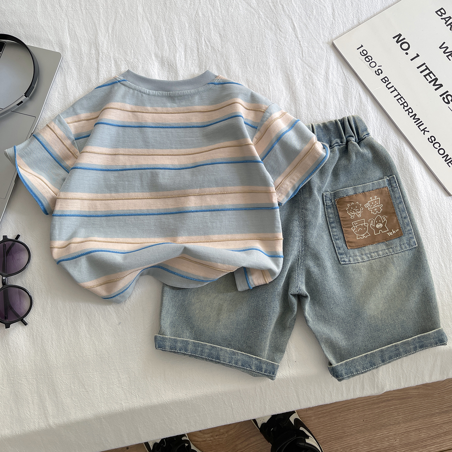 男童夏季套装帅气儿童牛仔短裤两件套2025新款男宝宝薄款条纹短袖