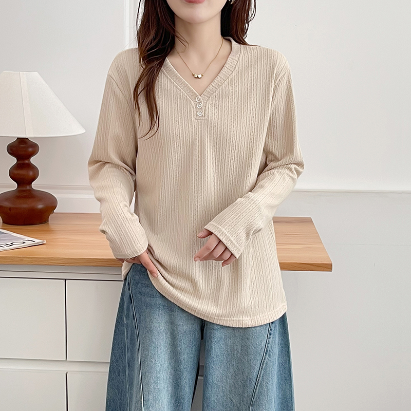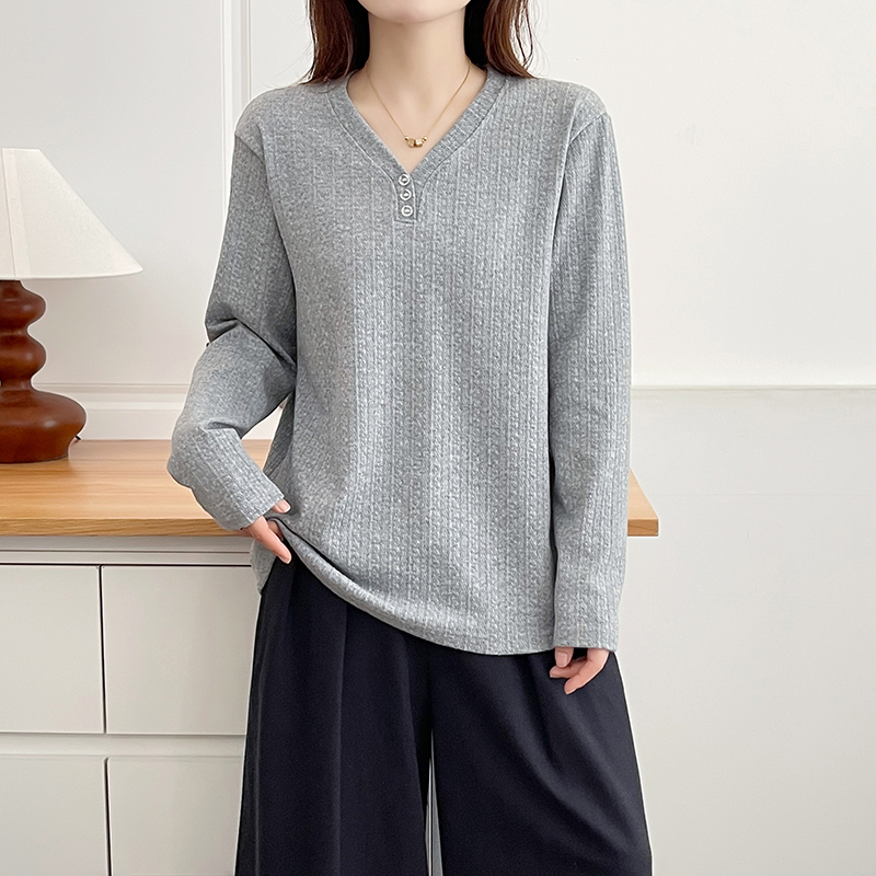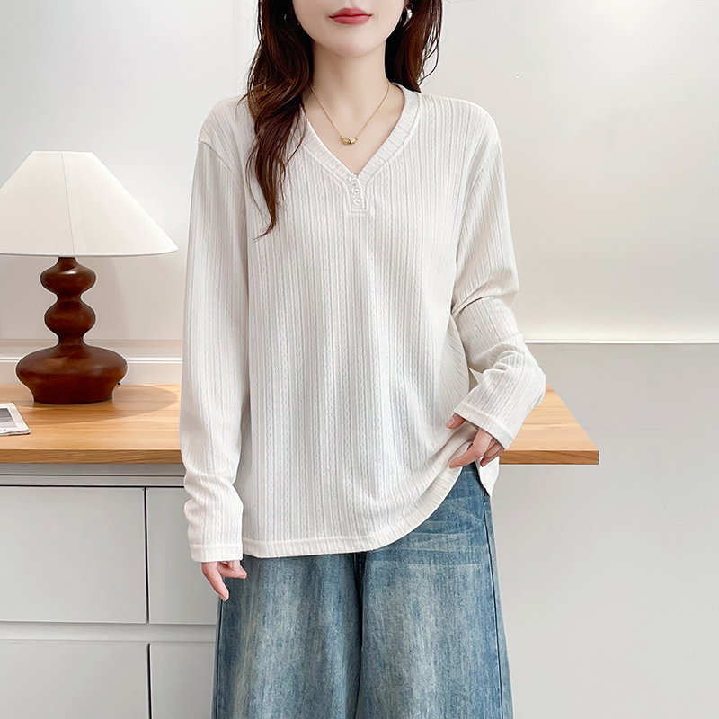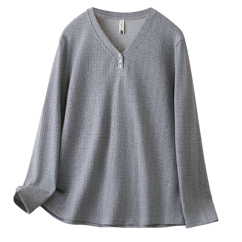 大码女装半开V领长袖T恤女春秋胖mm简约打底衫遮肚子显瘦正肩上衣