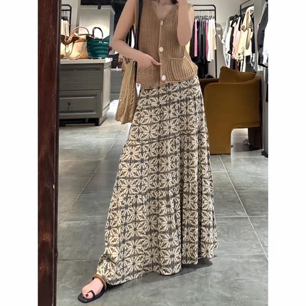 度假风优雅温柔设计感独特2025年夏新款杏色印花长裙遮胯显瘦女装