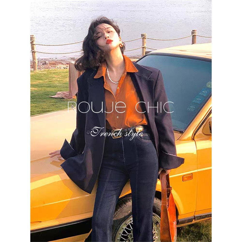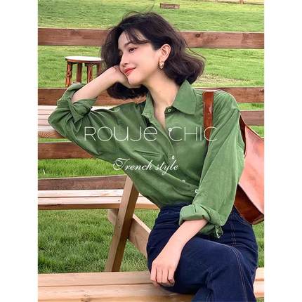 法国rouje chic法式设计感绿色Polo领灯笼芯衬衫女春别致小众上衣