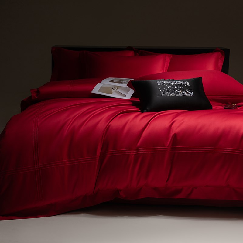 轻奢风大红色婚庆四件套100S长绒棉被套纯色结婚床单床上用品