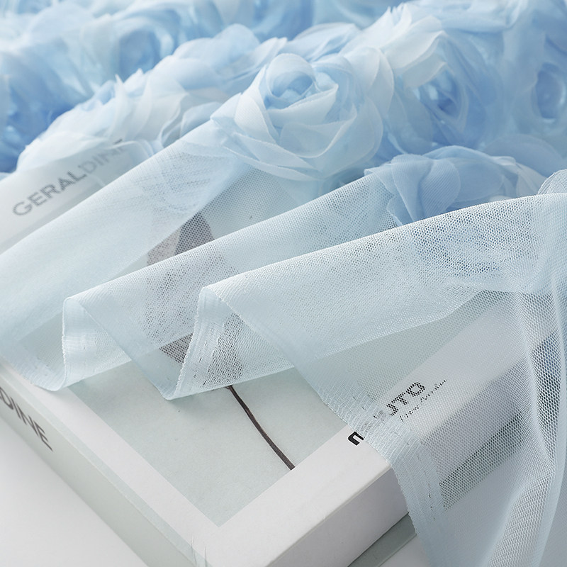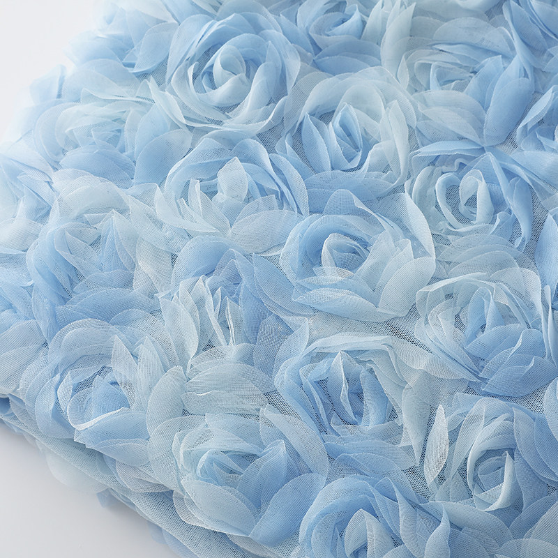重工精致浅蓝撞色晕染3D立体玫瑰盘花网纱布料蓬蓬裙礼服童装面料