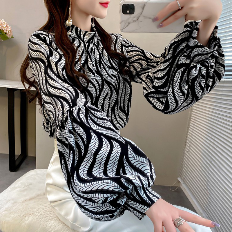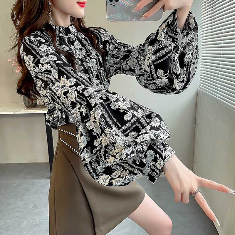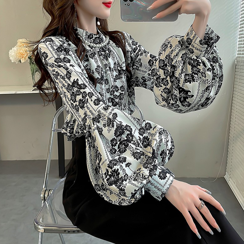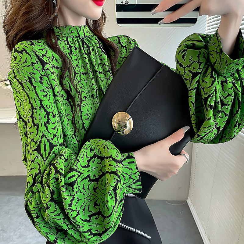 韩版气质名媛立领衬衫女宽松慵懒风衬衣绿色独特印花灯笼袖上衣秋