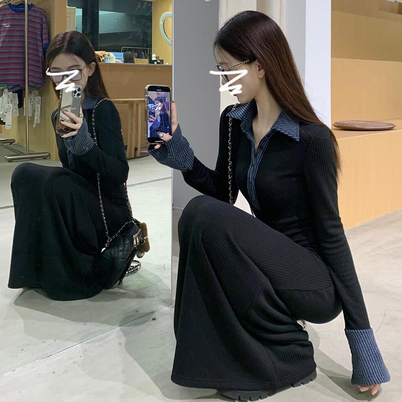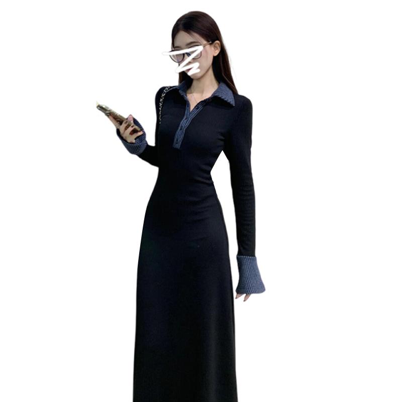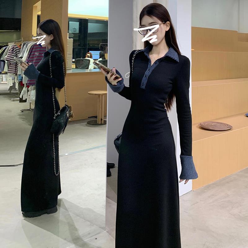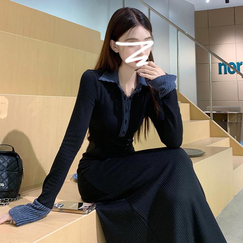 法式黑色polo针织连衣裙子女秋冬季2024新款内搭打底气质鱼尾长裙