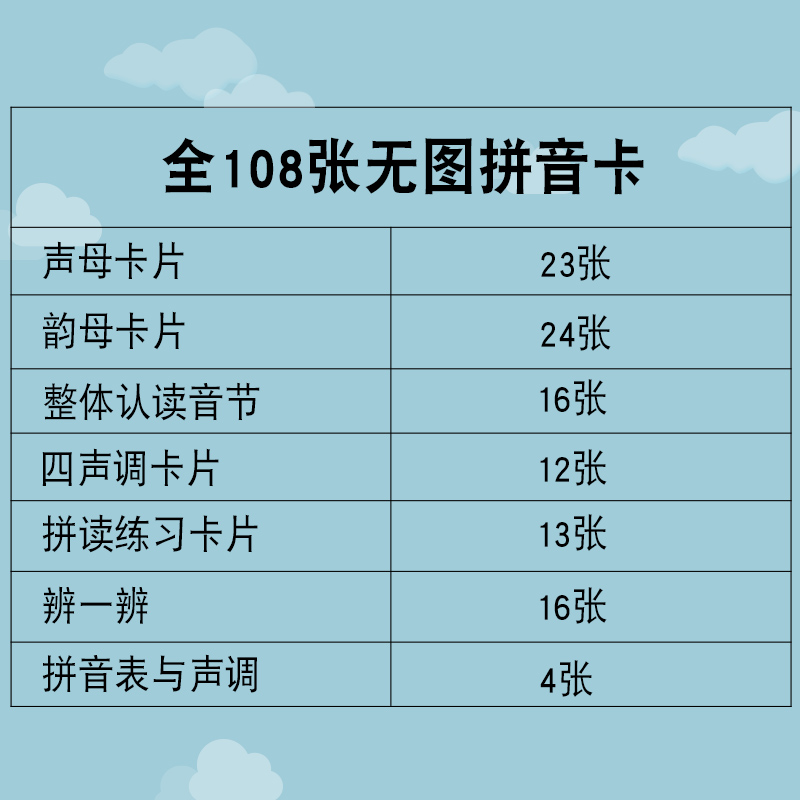 108张无图拼音卡片小学生一年级认汉语拼音字母四声调卡拼音卡儿童幼儿园声母韵母整体认读拼音学习教材幼小衔接拼音拼读训练识字