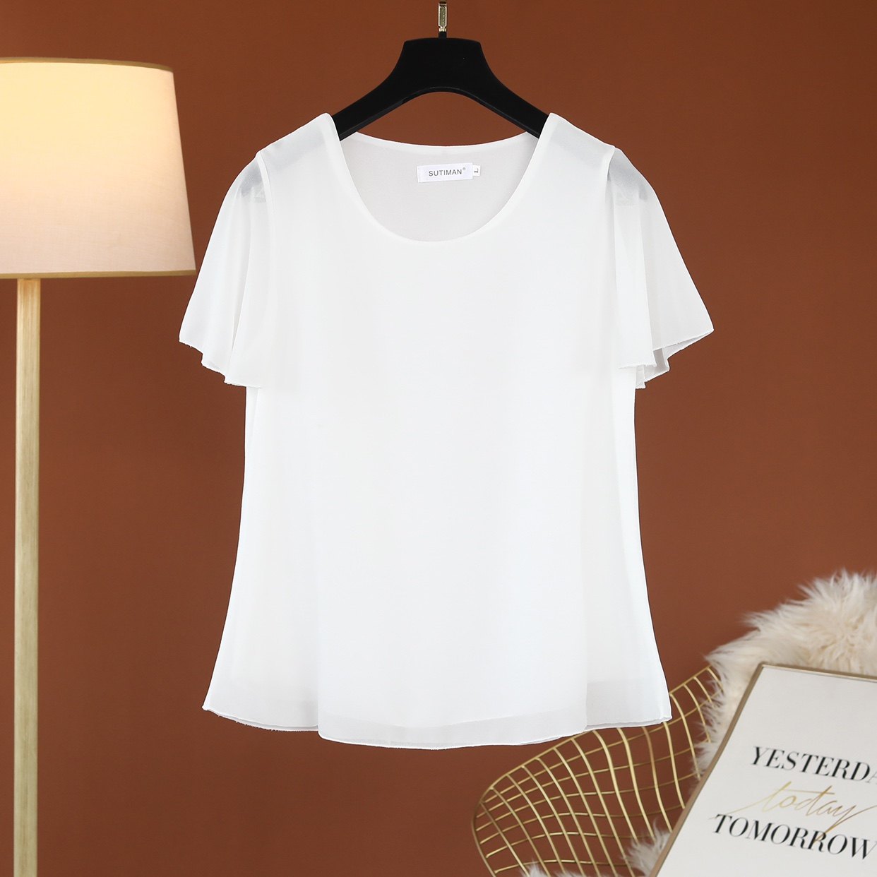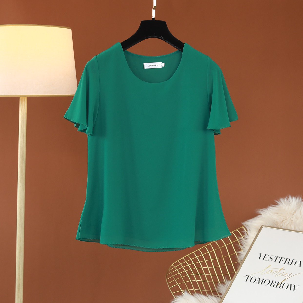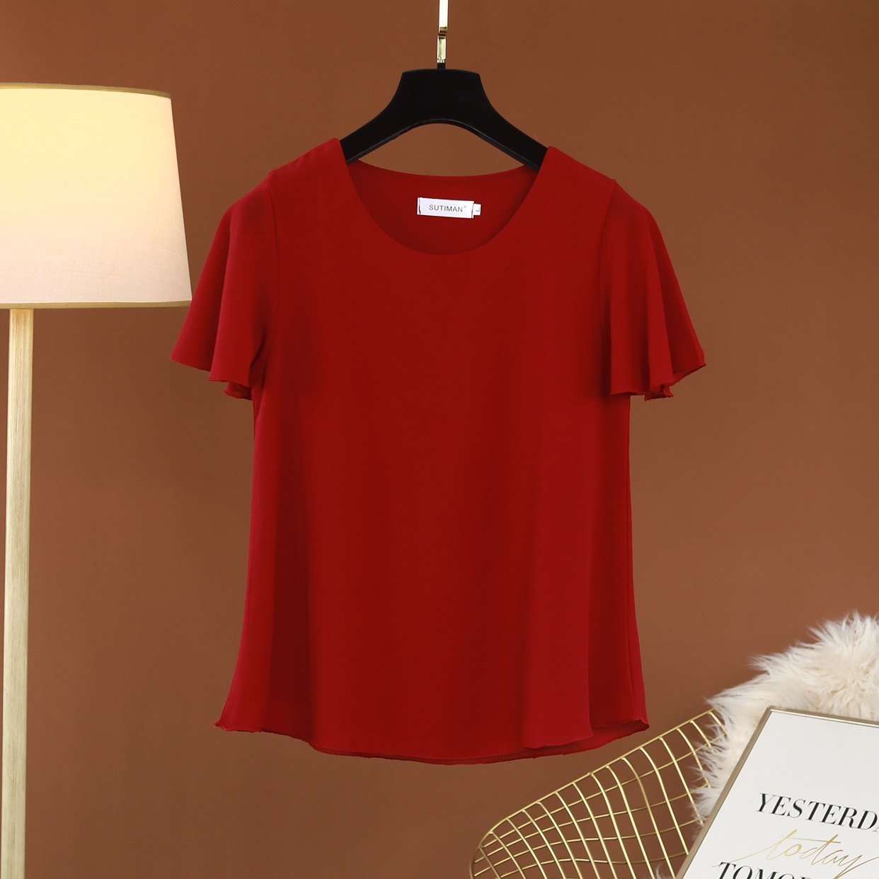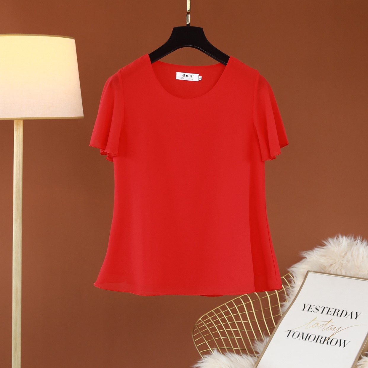 2023夏季新款欧洲站女装圆领短袖T恤韩版宽松大码胖妹妹雪纺上衣