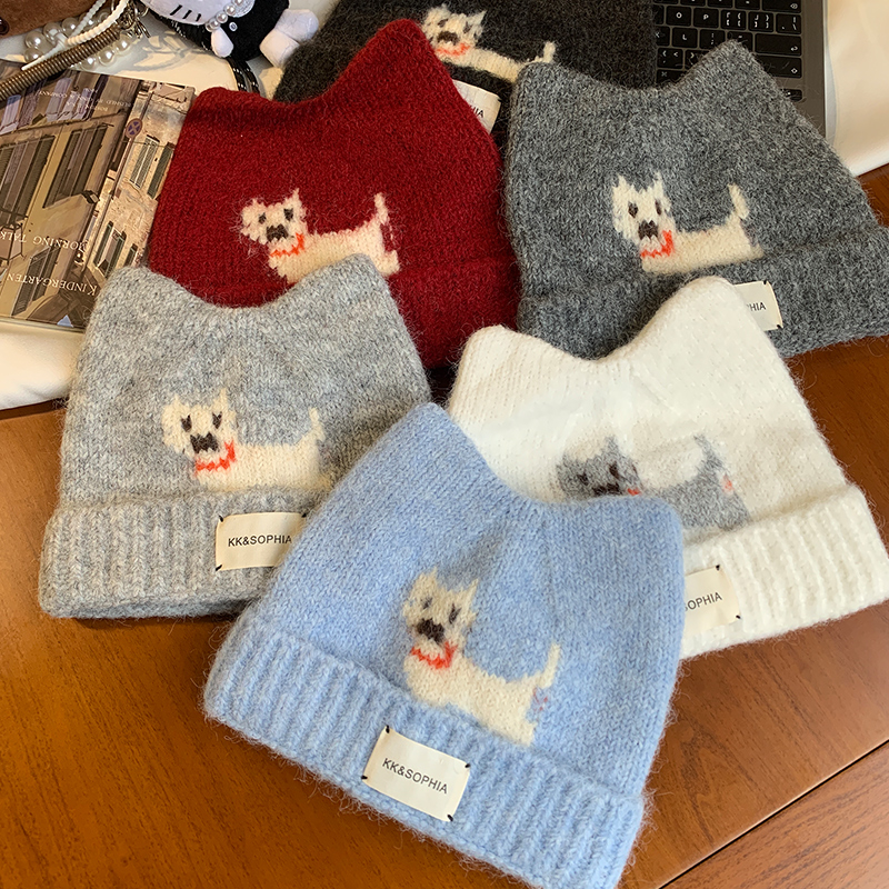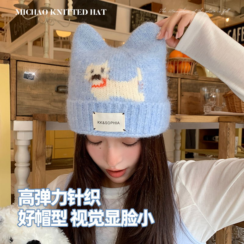 可爱小狗帽子女2025新款猫耳朵毛线帽秋冬保暖百搭蓝色针织帽冷帽