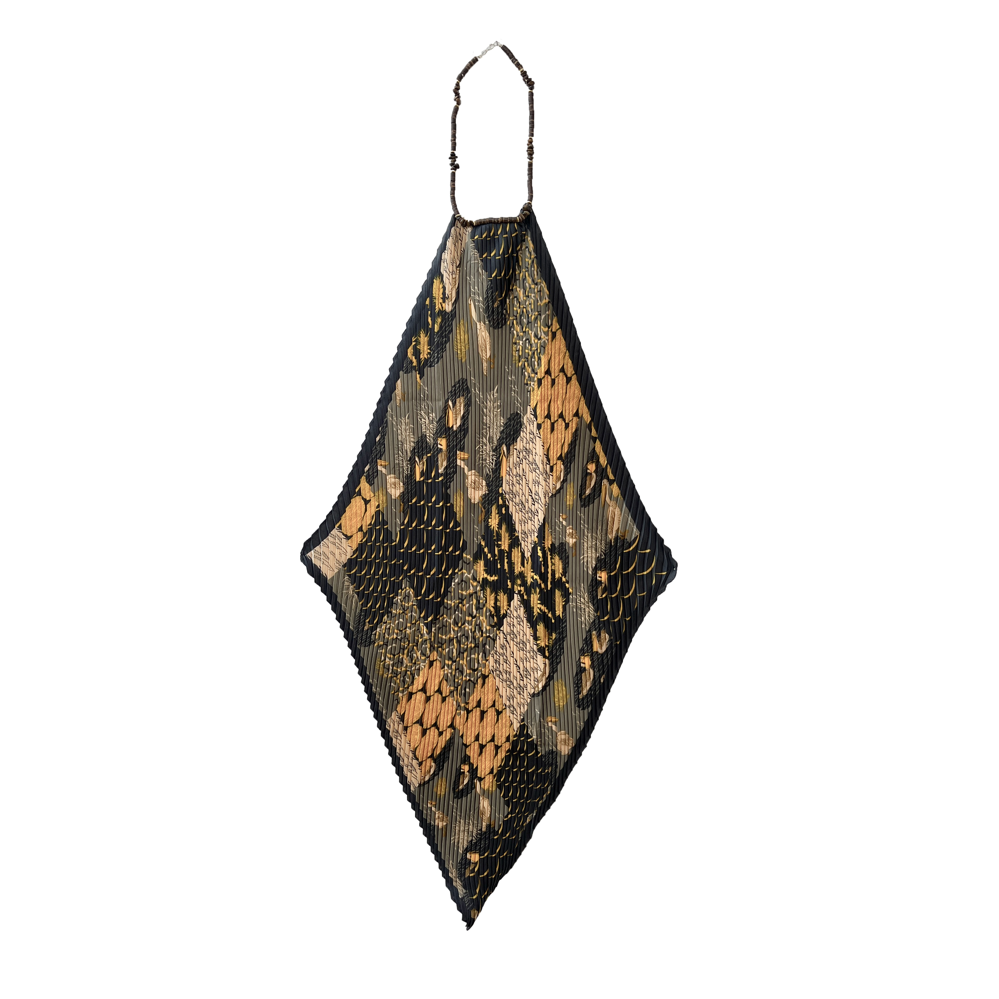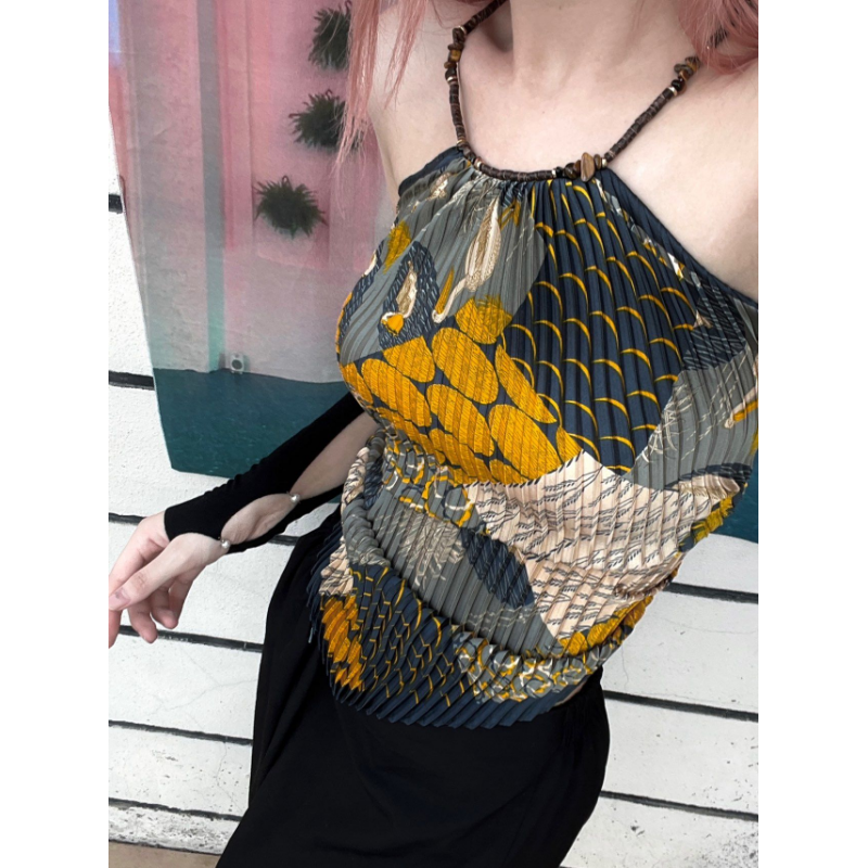ANTIMOON金棕绿虎眼石椰壳露背印花褶皱艺术辣妹吊带度假丝巾上衣