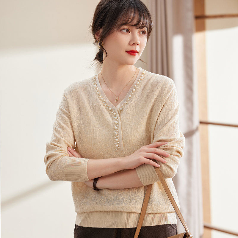 喜卉妈妈秋季新款V领气质针织衫中老年女装春秋洋气宽松打底上衣