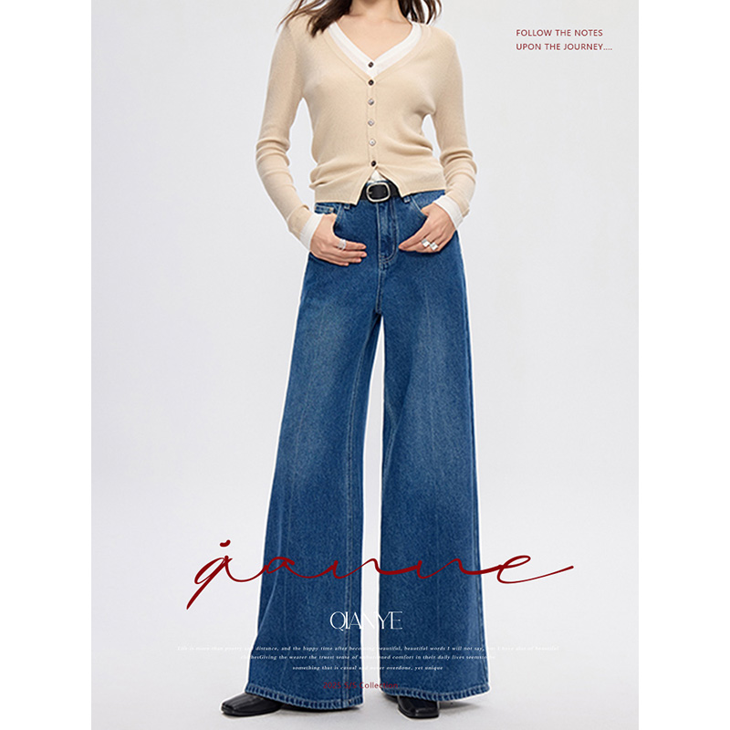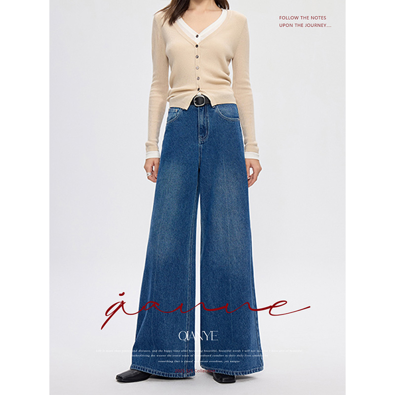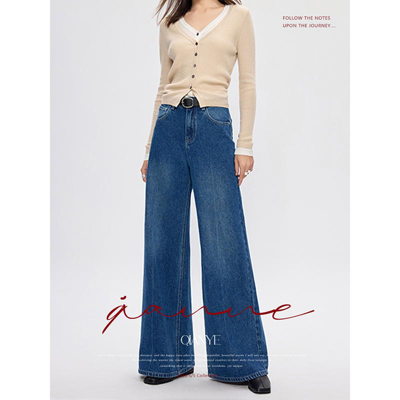 高品质蓝色牛仔裤女2025新款秋季阔腿宽松美式拖地修身垂感直筒裤