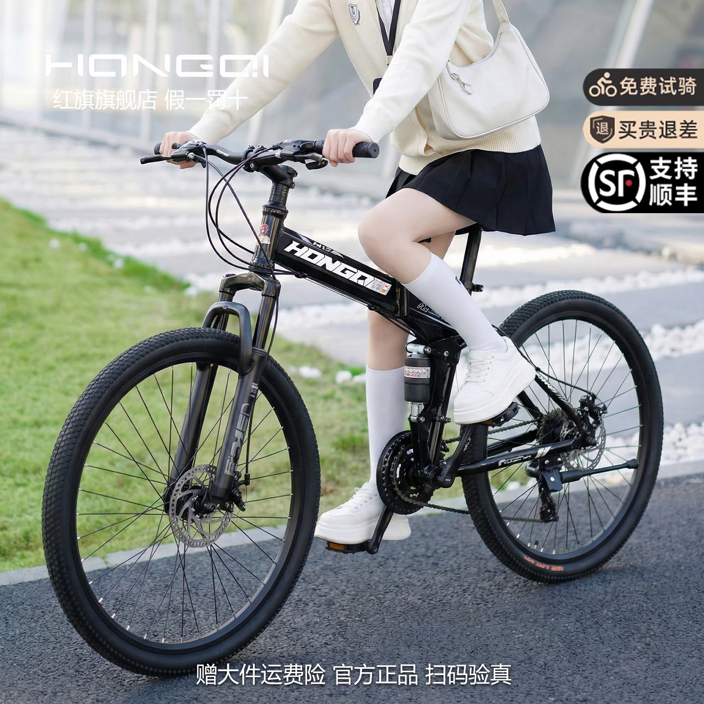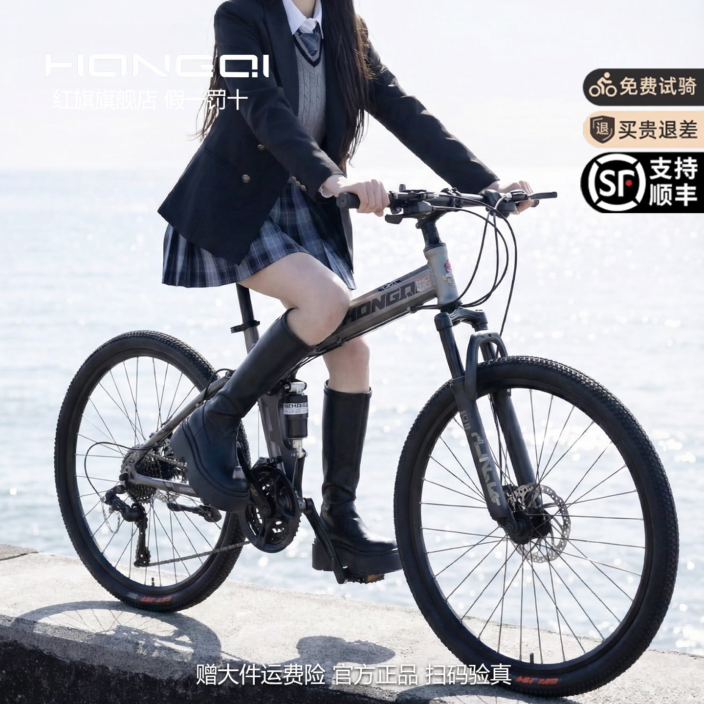 红旗折叠变速山地自行车女款学生青少年成人男变速双减震越野赛车