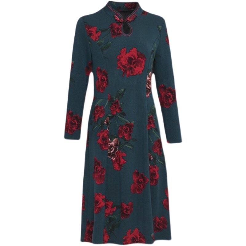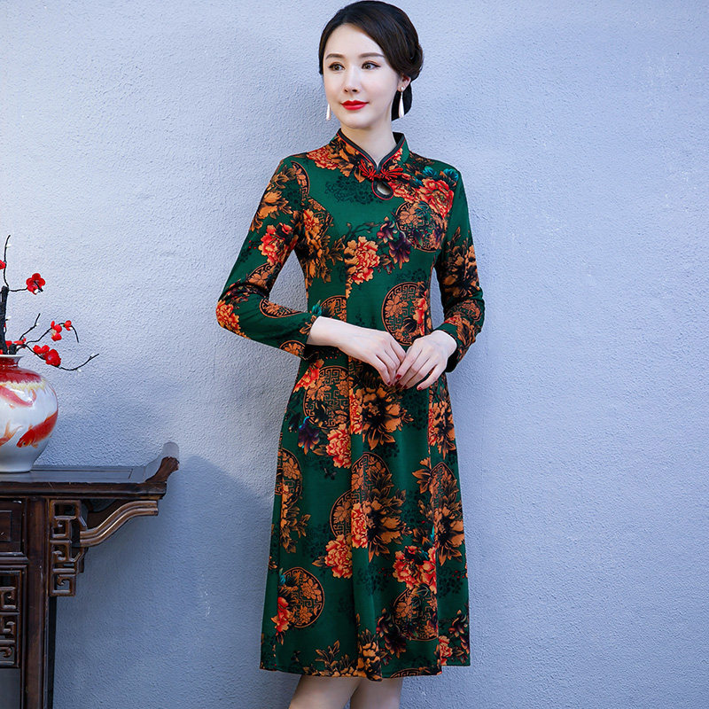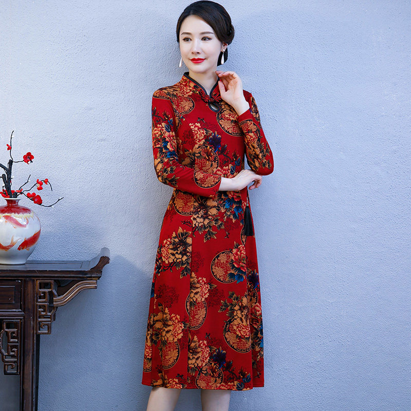复古妈妈装秋冬加绒改良版大摆旗袍裙中老年女式中长款气质连衣裙