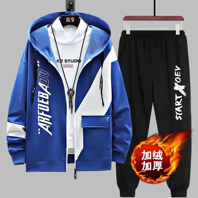 秋冬季连帽开衫夹克加绒加厚卫衣男青少年男生休闲运动套装1/2件